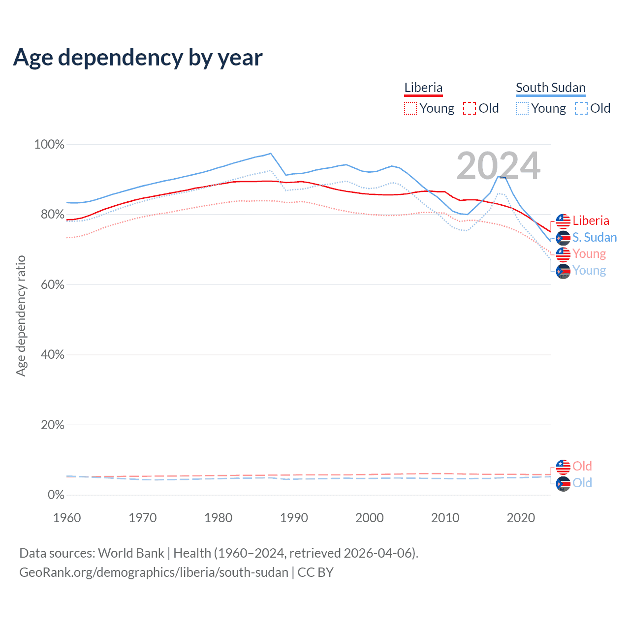 - The share of old-age demographic (65+) in Liberia is 3.3% vs 2.99% in South Sudan.