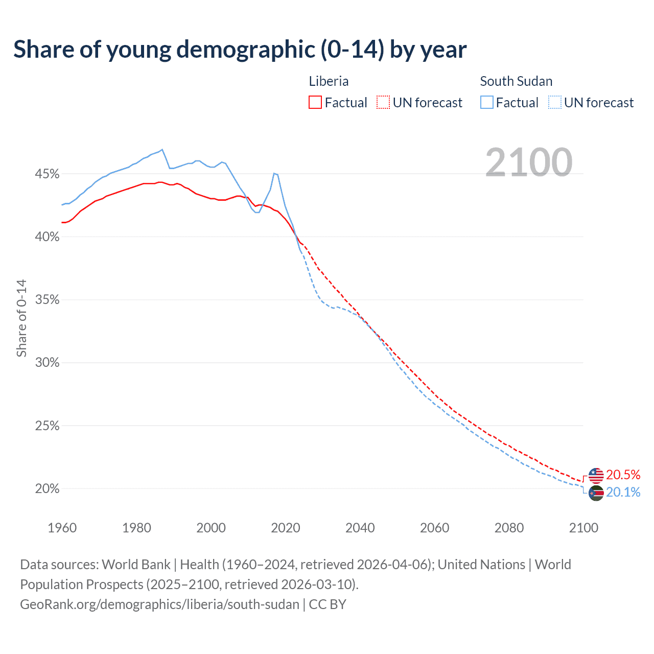 - The share of young demographic (0-15 years old) in Liberia is 39.5% vs 38.9% in South Sudan.