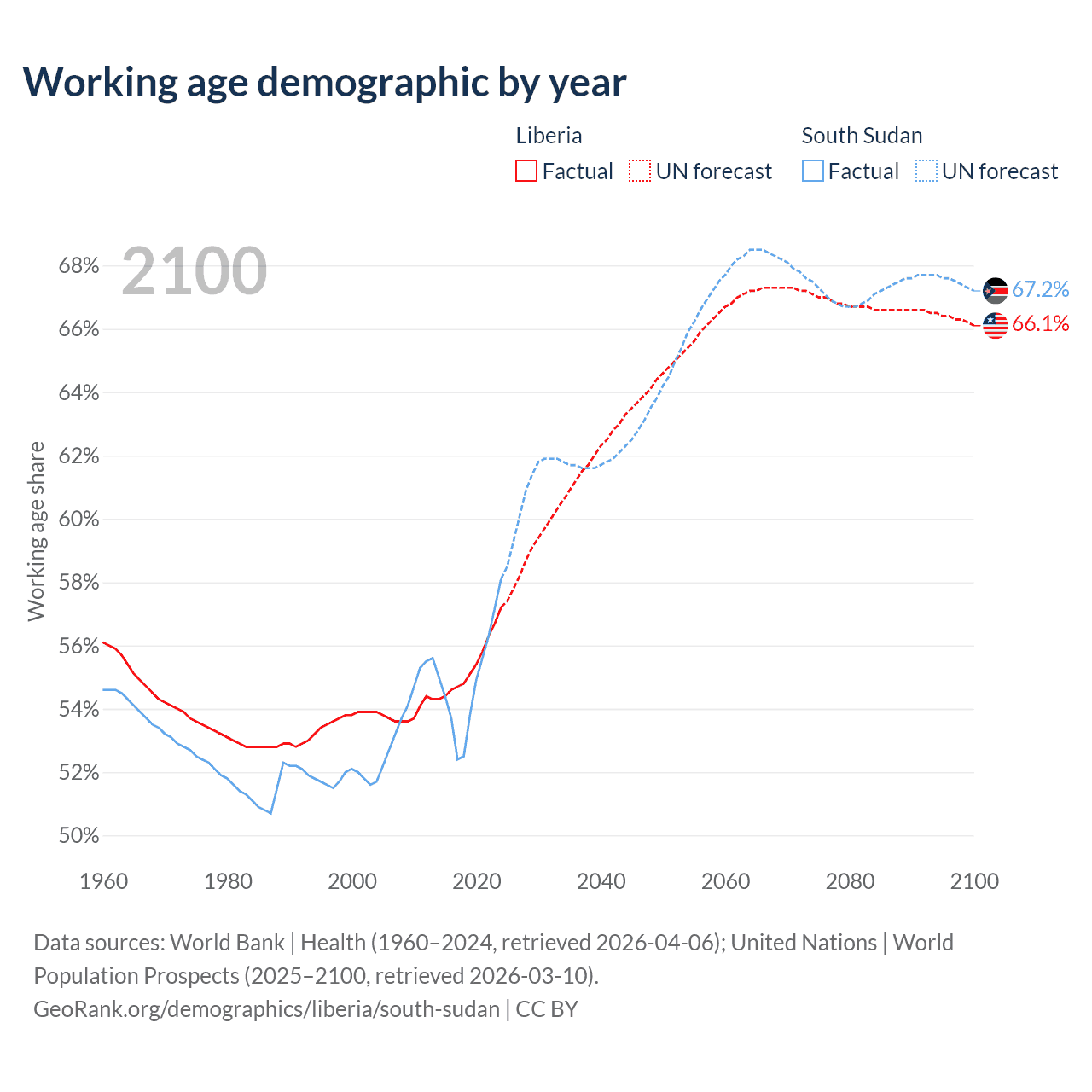 The share of older people aged 65 and over is 3.3% in Liberia and 2.99% in South Sudan. Life expectancy in Liberia compared to South Sudan .