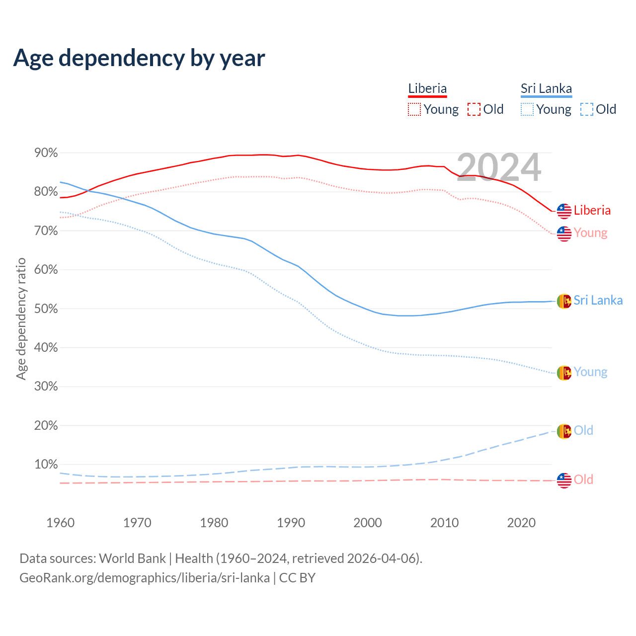 - Liberia is ranked 169/196 by median age (oldest to youngest) vs 81/196 for Sri Lanka.