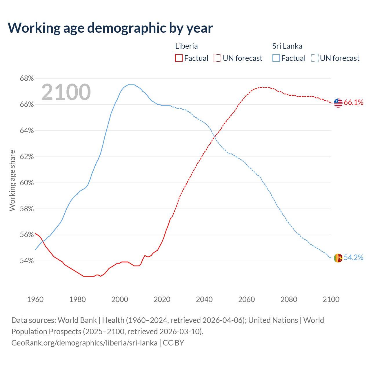 The share of older people aged 65 and over is 3.3% in Liberia and 12.1% in Sri Lanka. Life expectancy in Liberia compared to Sri Lanka .