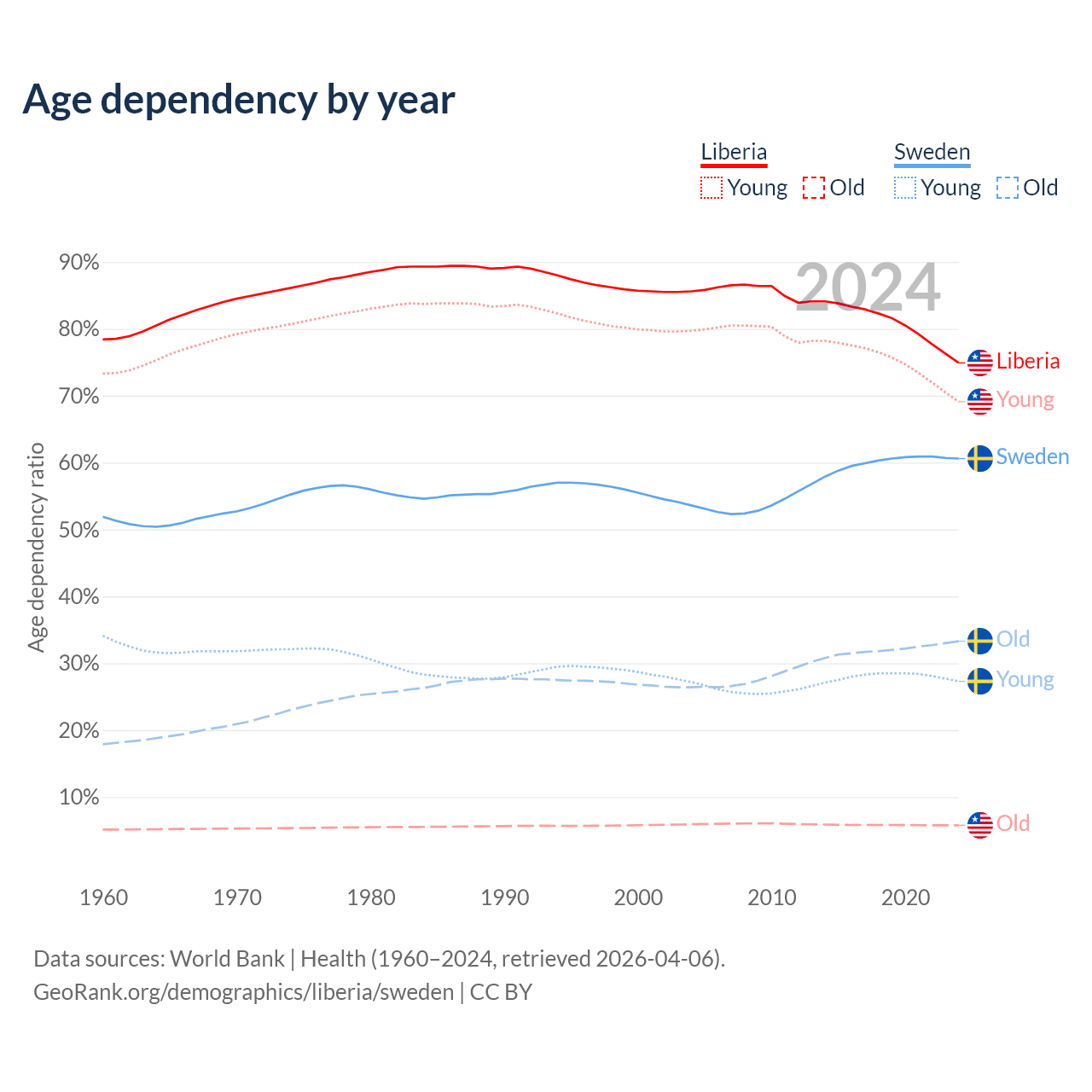 - Liberia is ranked 169/196 by median age (oldest to youngest) vs 39/196 for Sweden.
