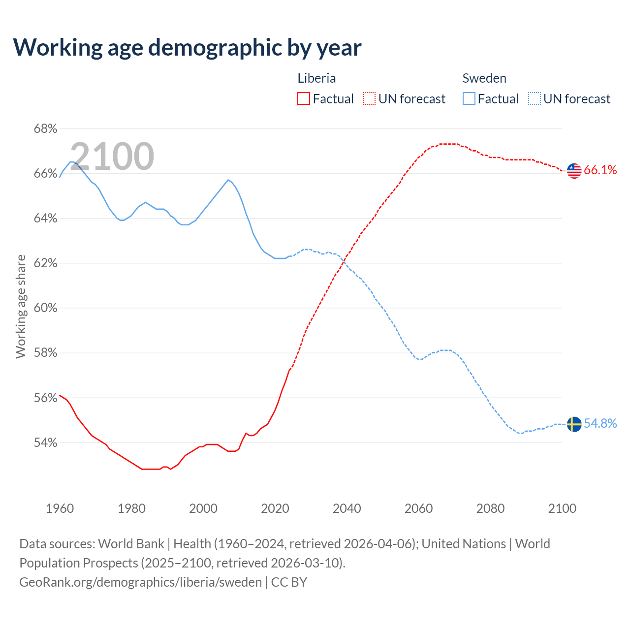 The share of older people aged 65 and over is 3.3% in Liberia and 20.7% in Sweden. Life expectancy in Liberia compared to Sweden .