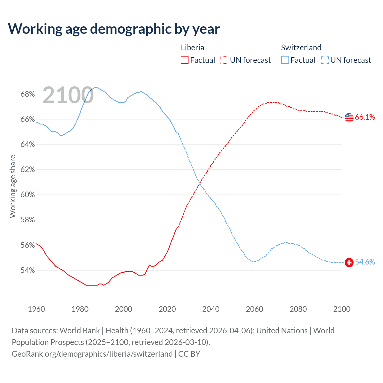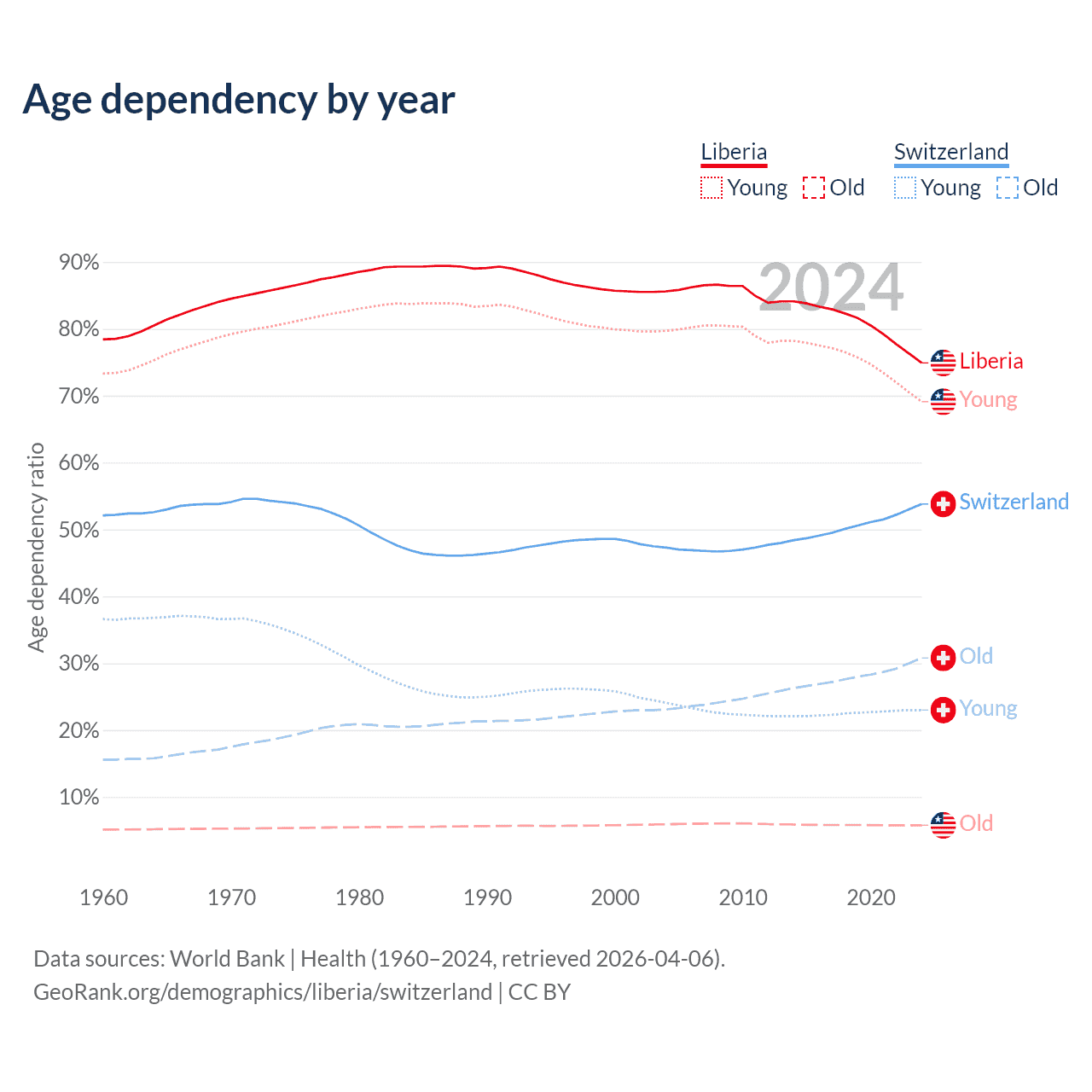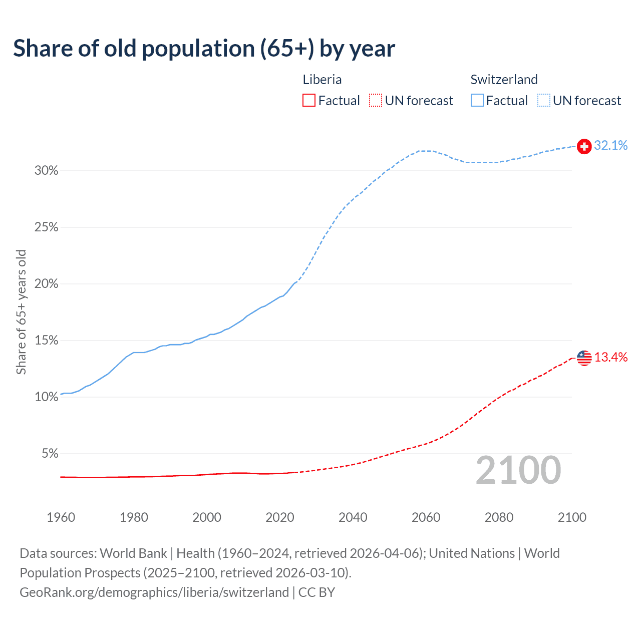 The share of older people aged 65 and over is 3.3% in Liberia and 20% in Switzerland. Life expectancy in Liberia compared to Switzerland .