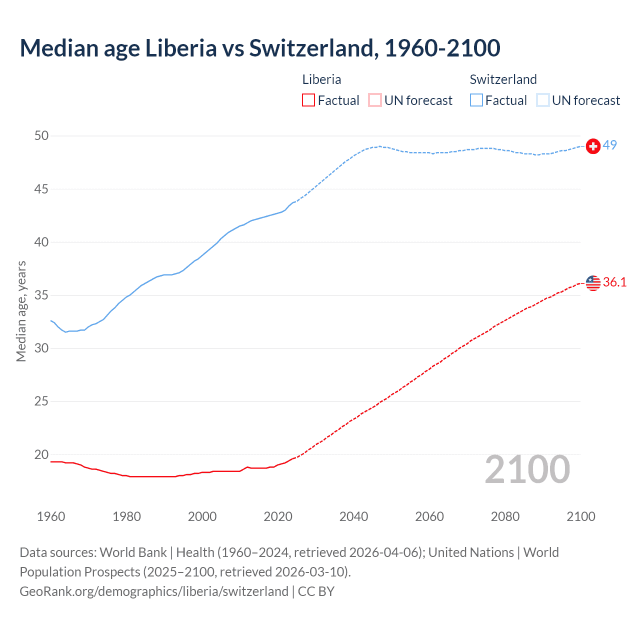 - Liberia is ranked 169/196 by median age (oldest to youngest) vs 24/196 for Switzerland.