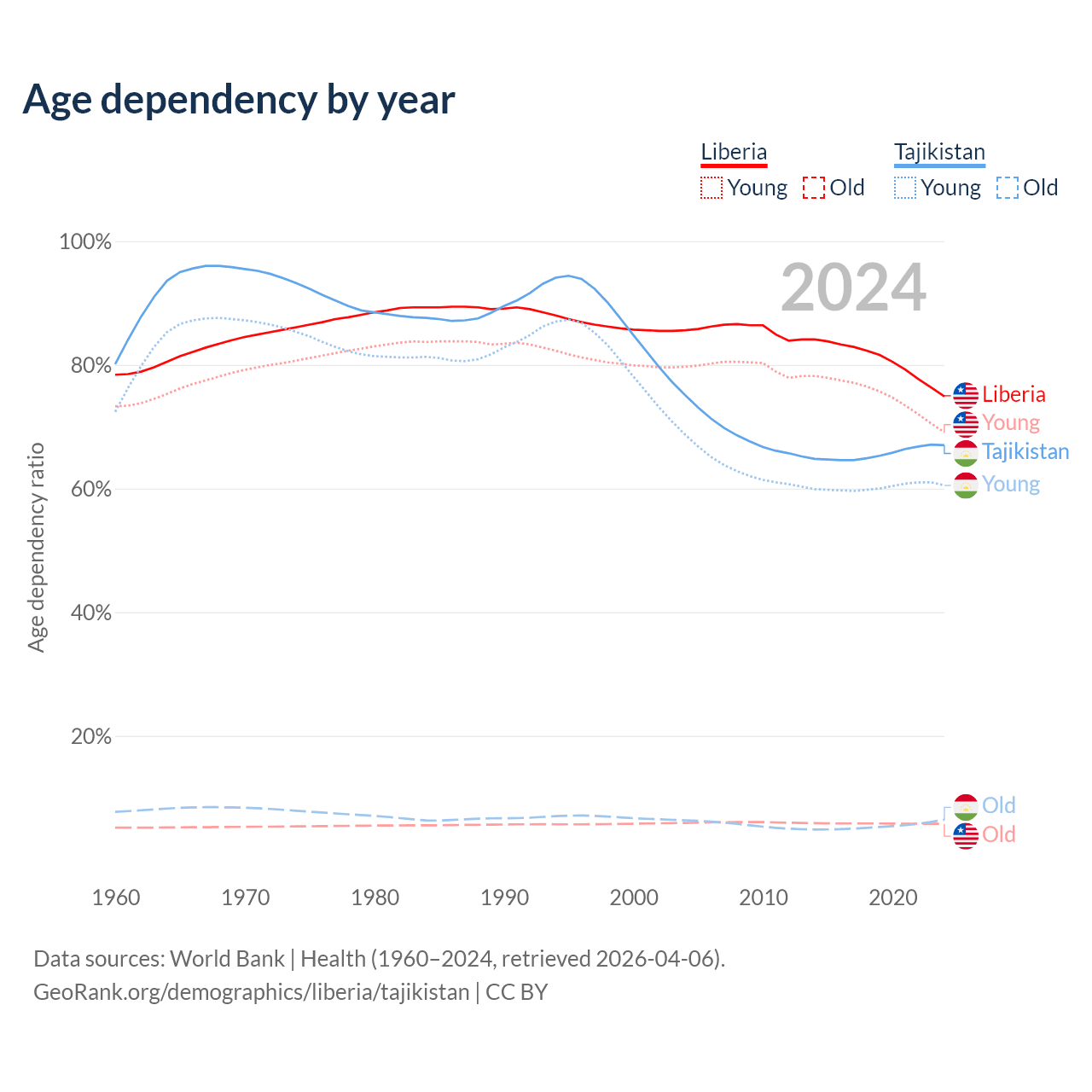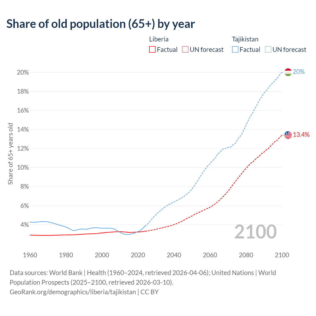 - The share of old-age demographic (65+) in Liberia is 3.3% vs 3.85% in Tajikistan.