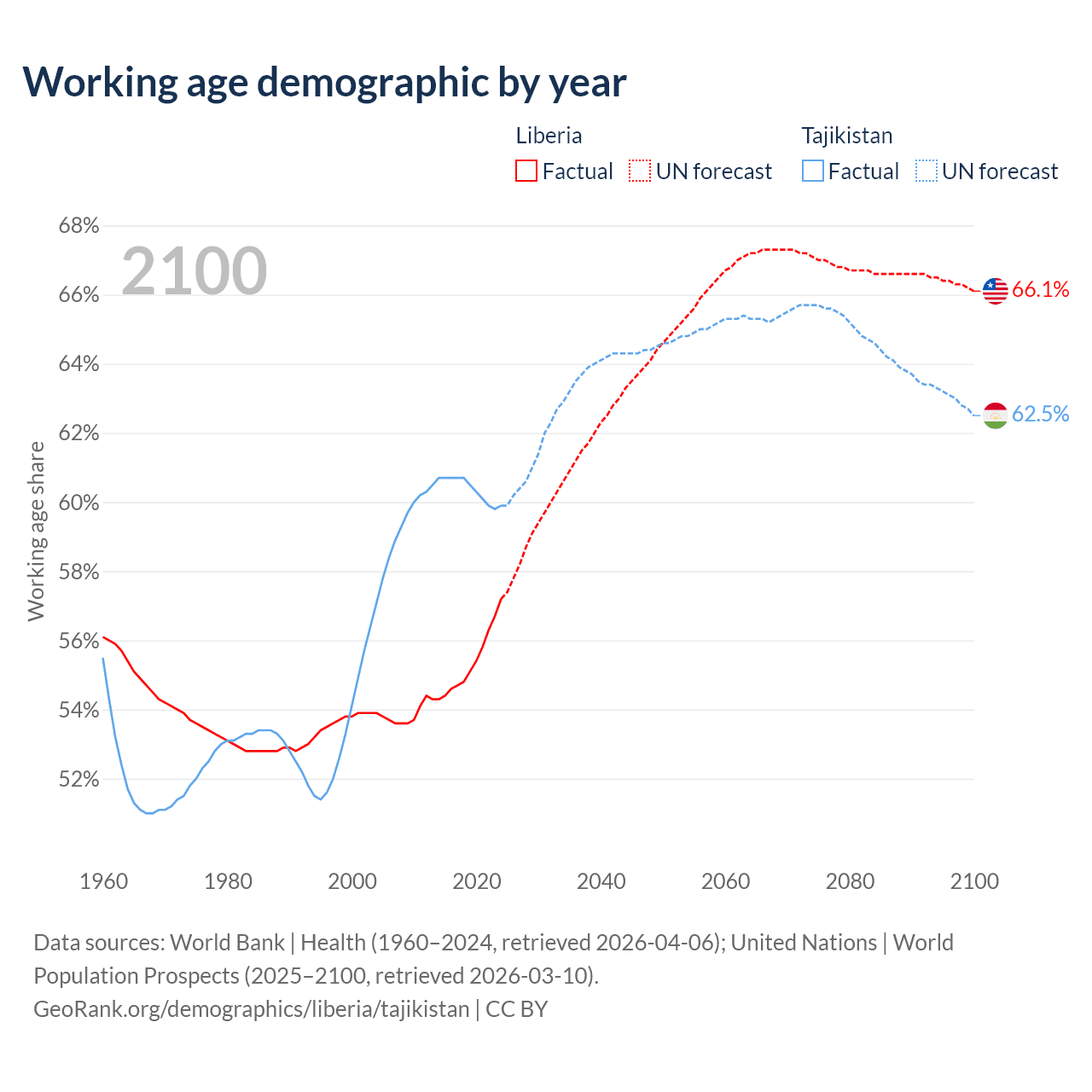 - Liberia has 3.37M working age adults (aged 15-64) vs 6.61M in Tajikistan.