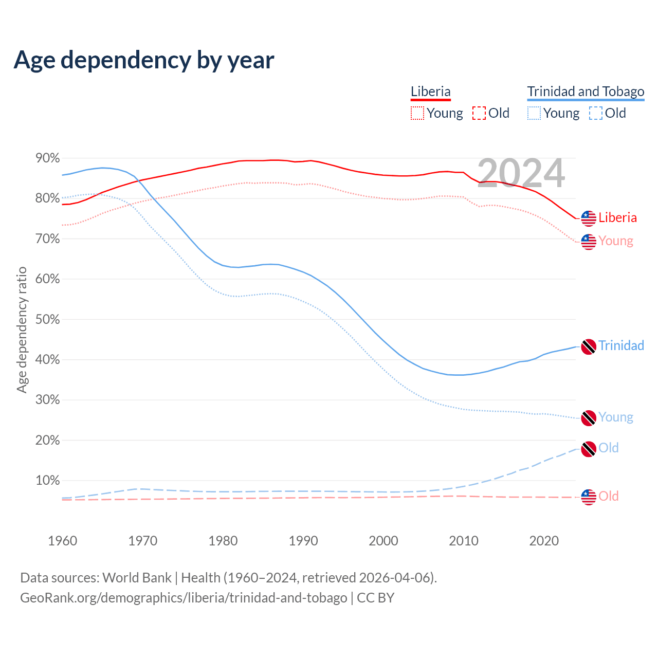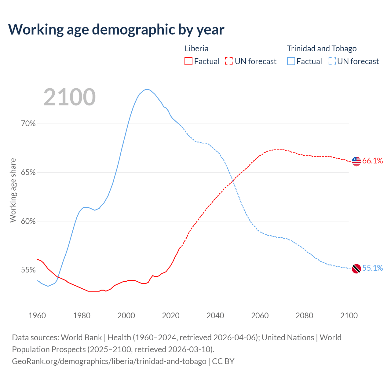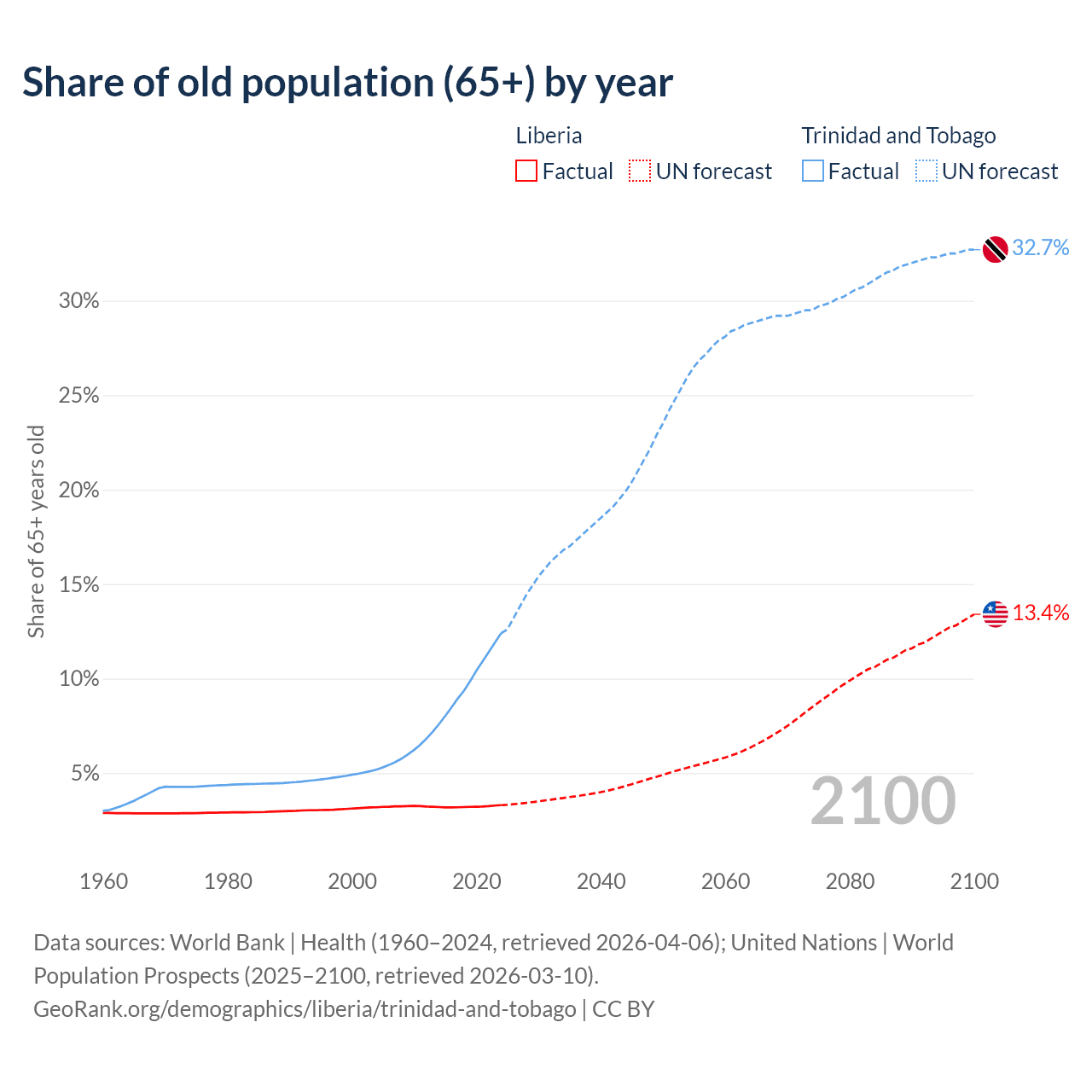 The share of older people aged 65 and over is 3.3% in Liberia and 12.4% in Trinidad and Tobago. Life expectancy in Liberia compared to Trinidad and Tobago .