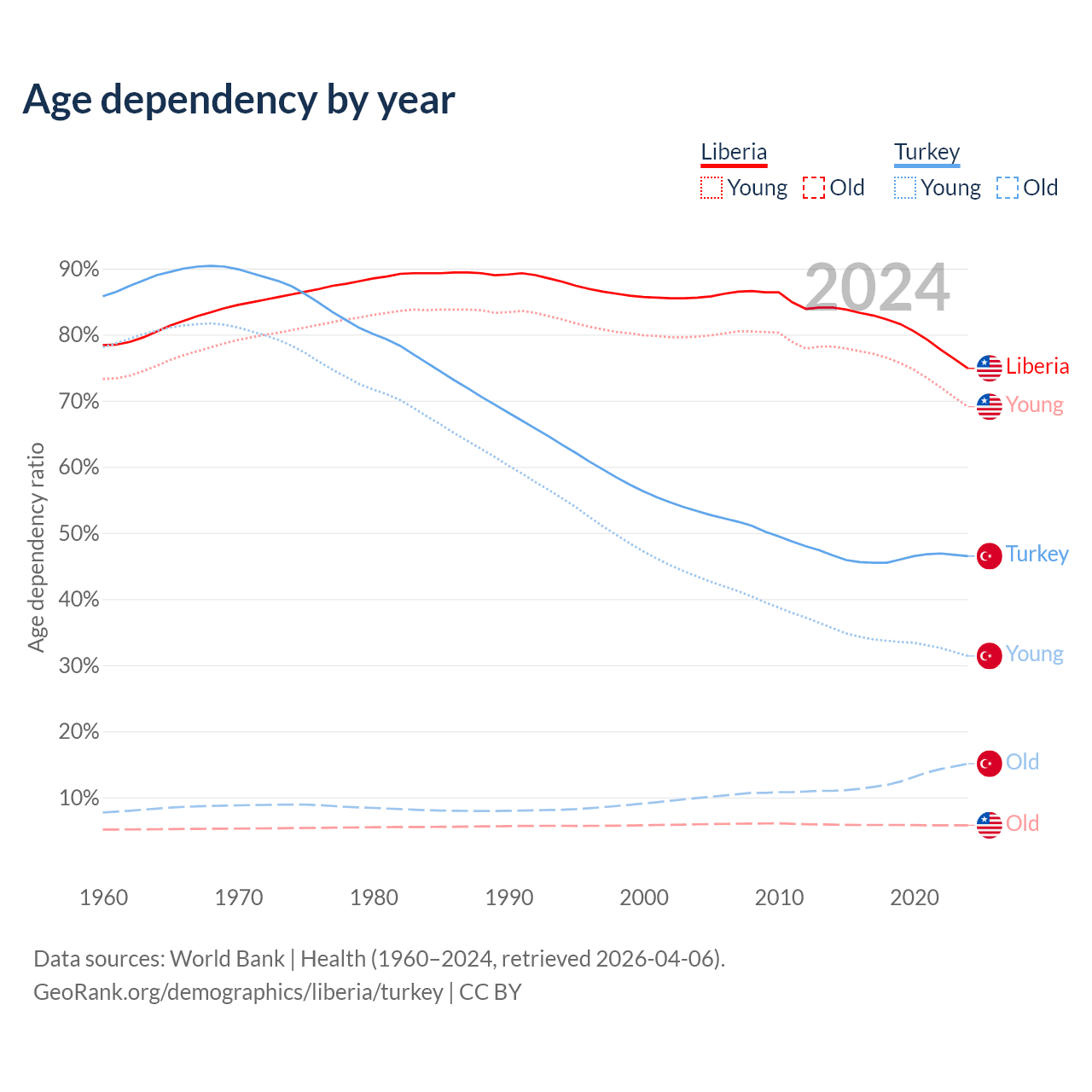 - Liberia is ranked 169/196 by median age (oldest to youngest) vs 83/196 for Turkey.