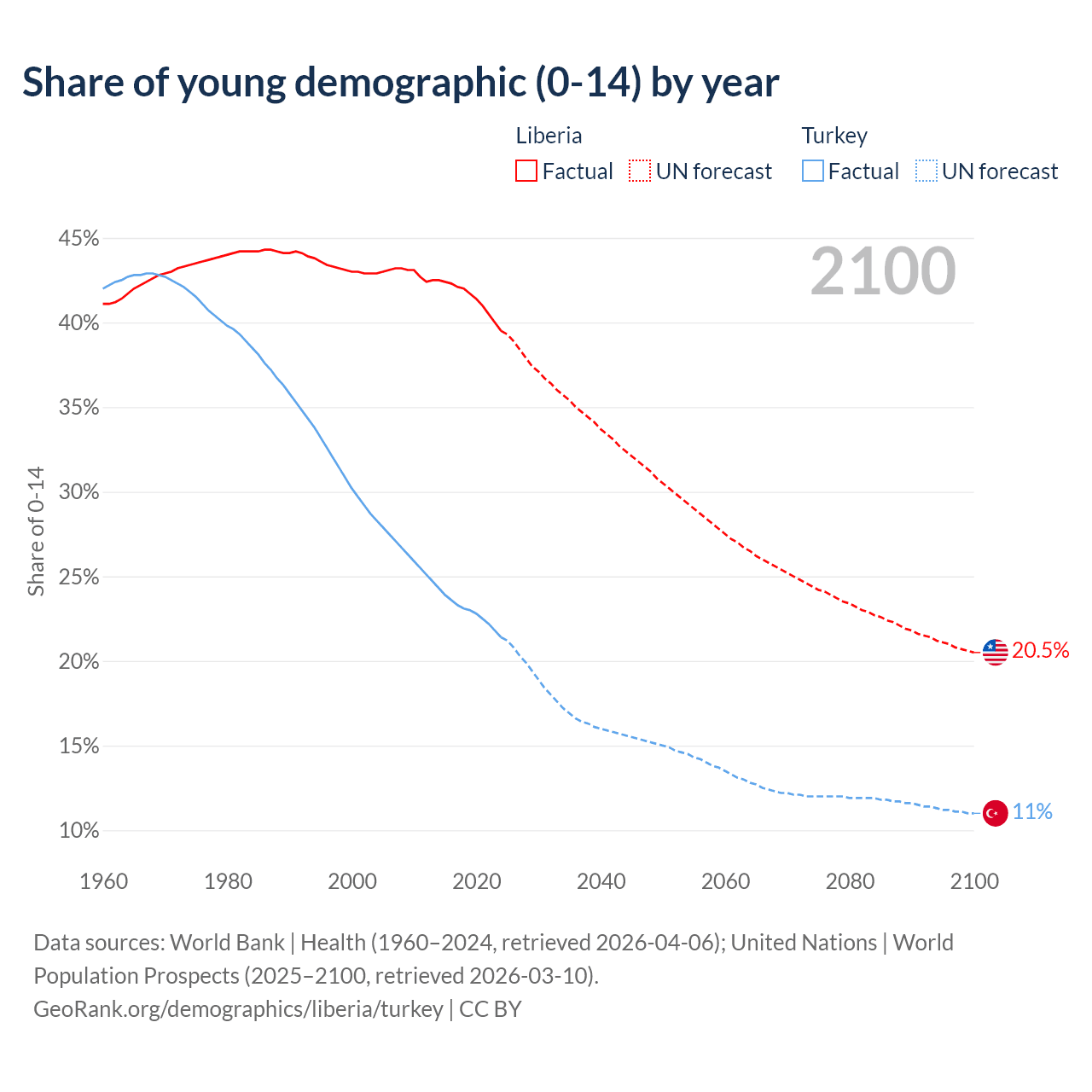- The share of young demographic (0-15 years old) in Liberia is 39.5% vs 21.4% in Turkey.