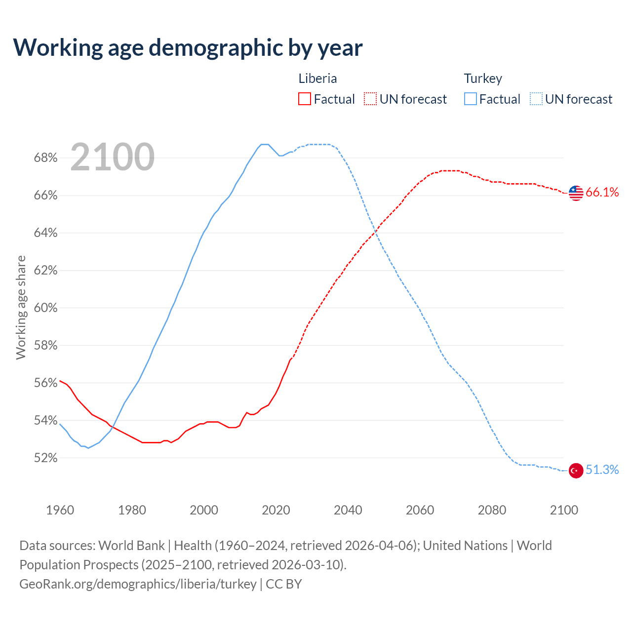 - Liberia has 3.37M working age adults (aged 15-64) vs 58.7M in Turkey.
