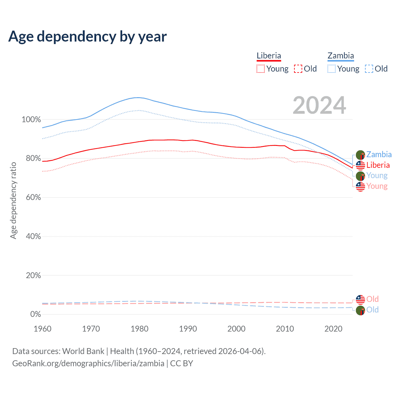 - Liberia is ranked 169/196 by median age (oldest to youngest) vs 182/196 for Zambia.