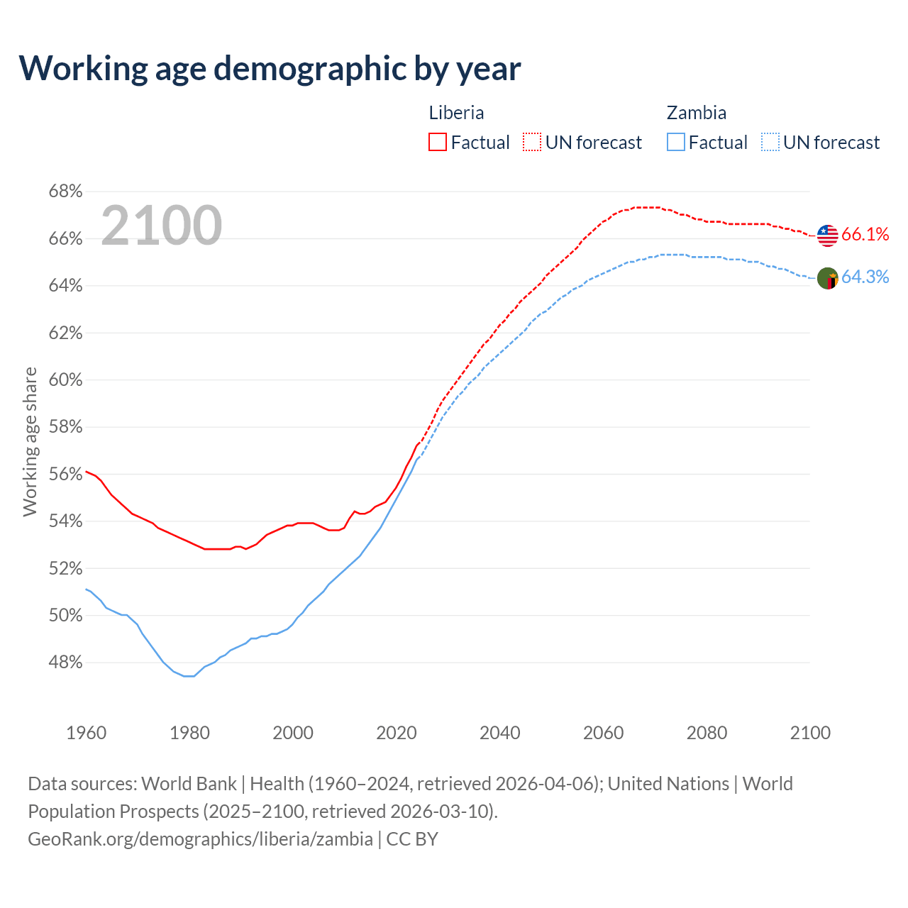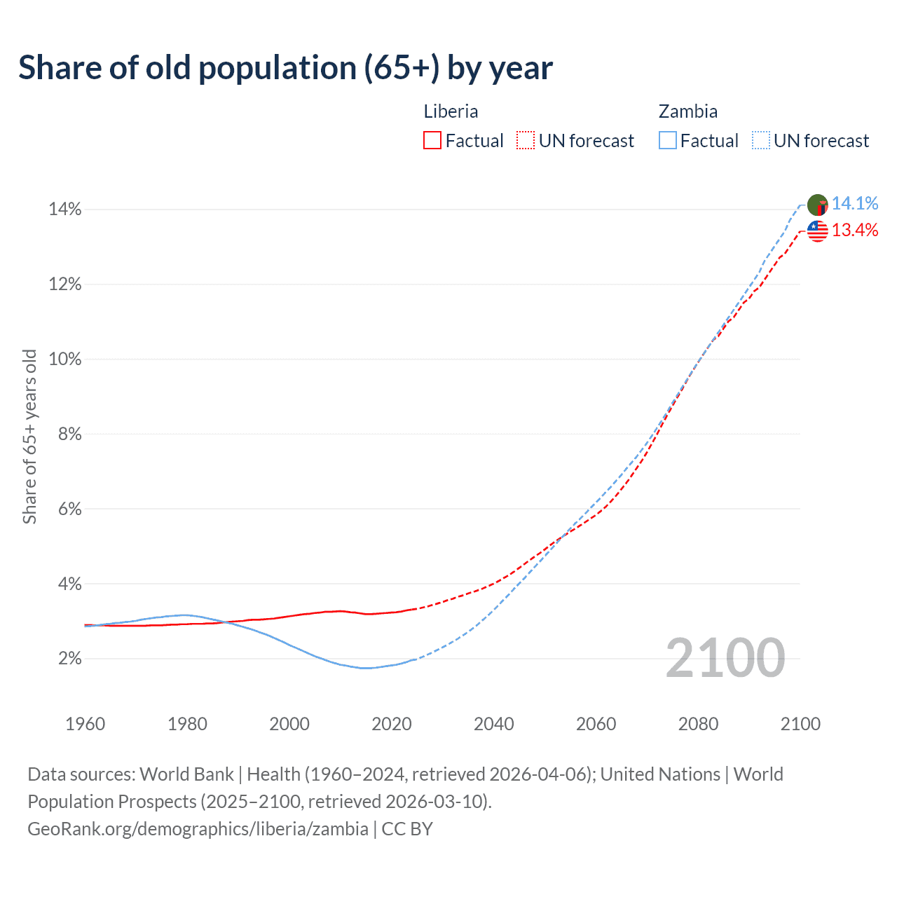 The share of older people aged 65 and over is 3.3% in Liberia and 1.95% in Zambia. Life expectancy in Liberia compared to Zambia .