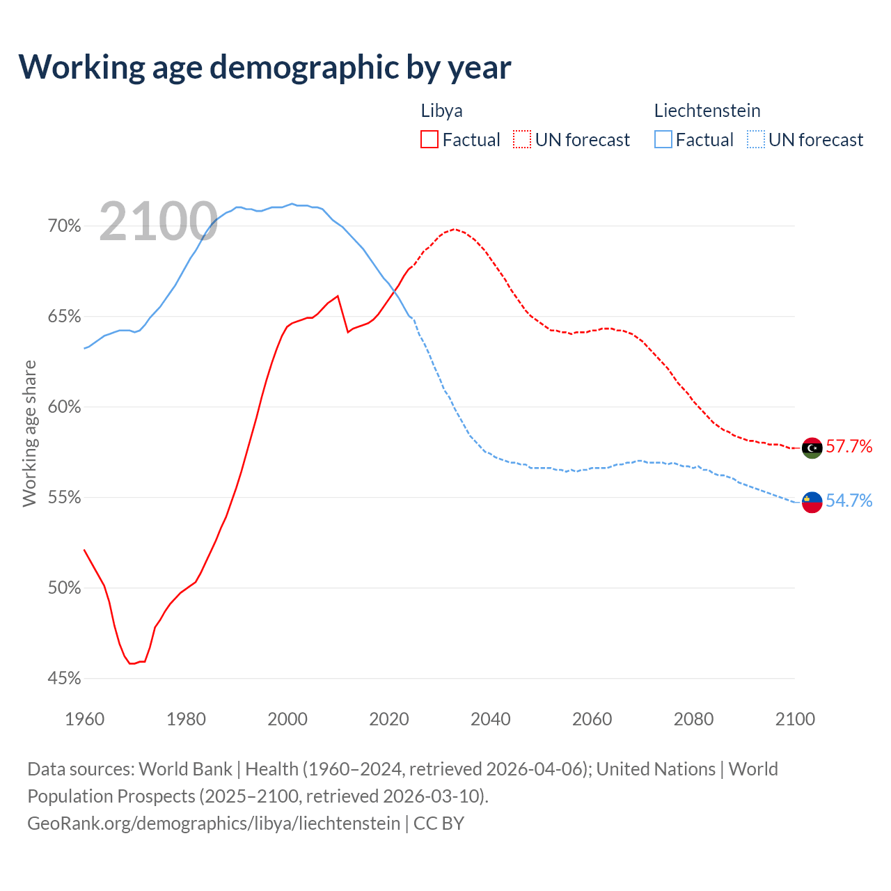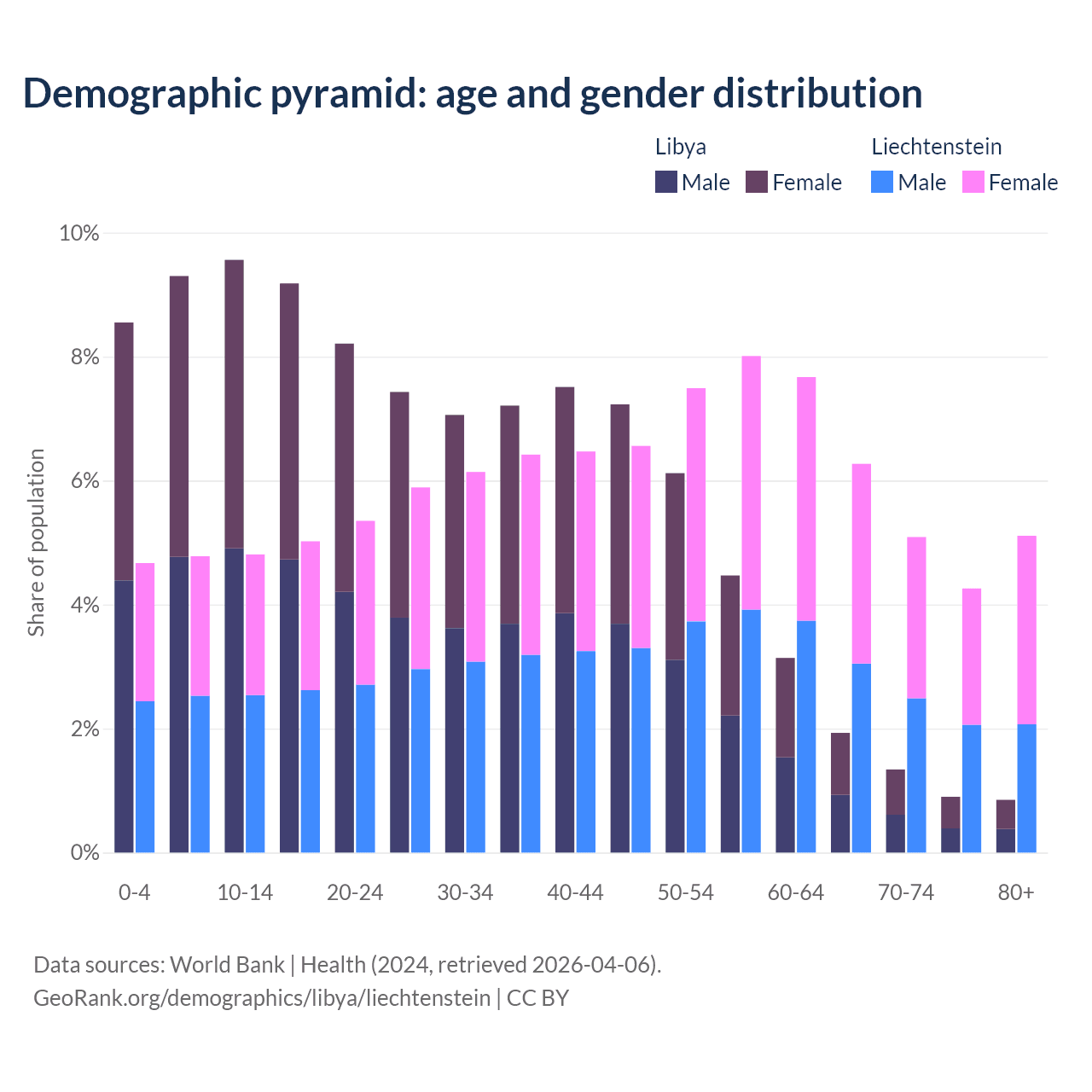 - The share of old-age demographic (65+) in Libya is 5.02% vs 20.7% in Liechtenstein.