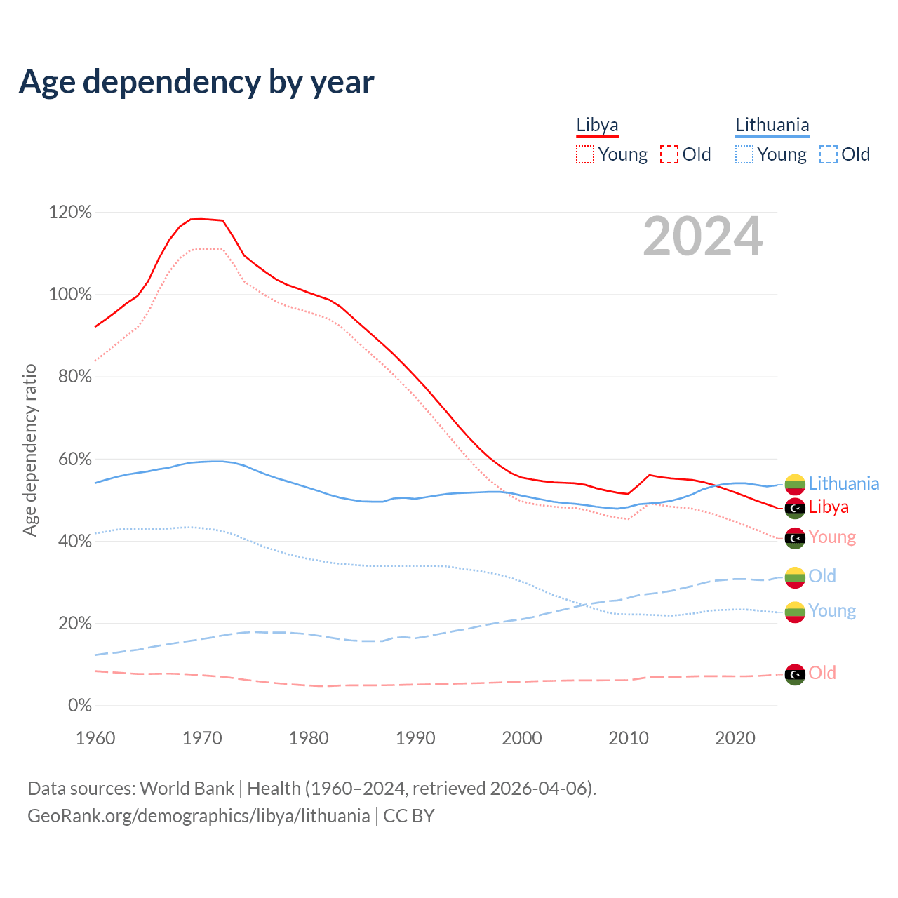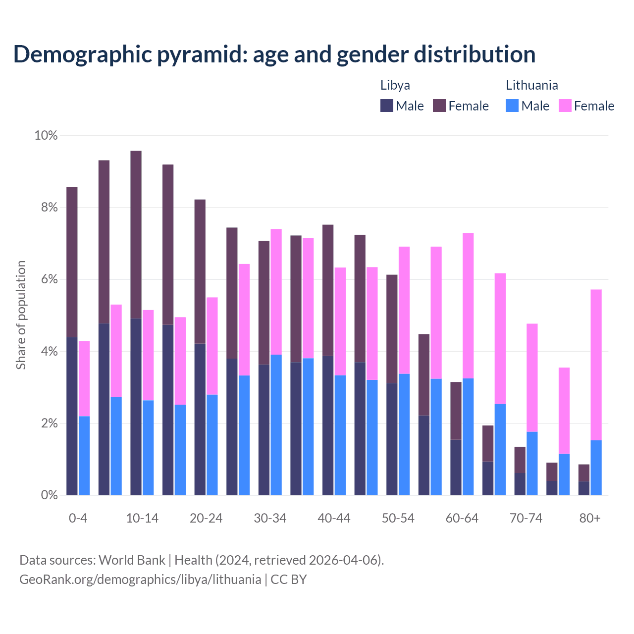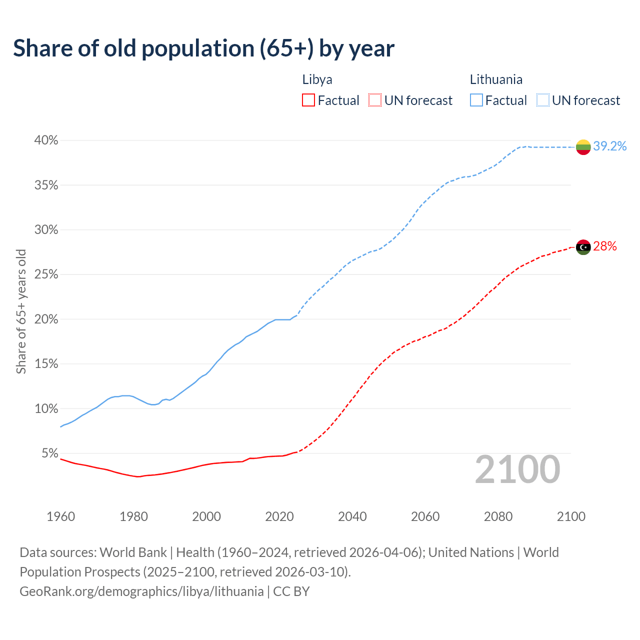 - The share of old-age demographic (65+) in Libya is 5.02% vs 20.2% in Lithuania.