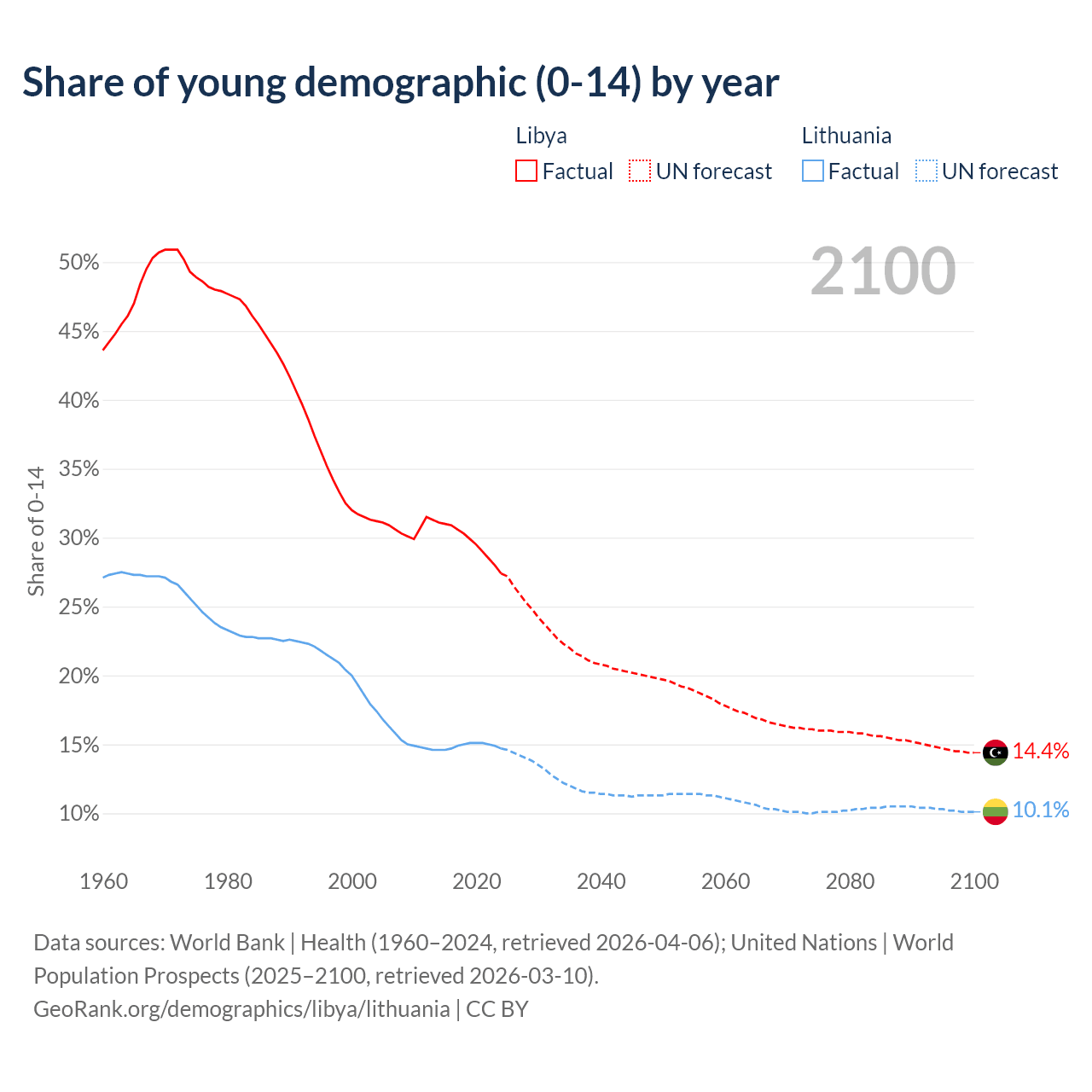 - The share of young demographic (0-15 years old) in Libya is 27.4% vs 14.7% in Lithuania.