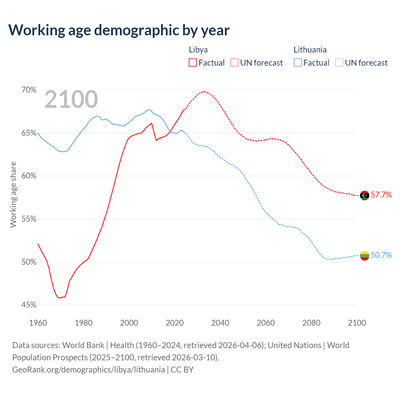 - Libya has 5.11M working age adults (aged 15-64) vs 1.84M in Lithuania.
