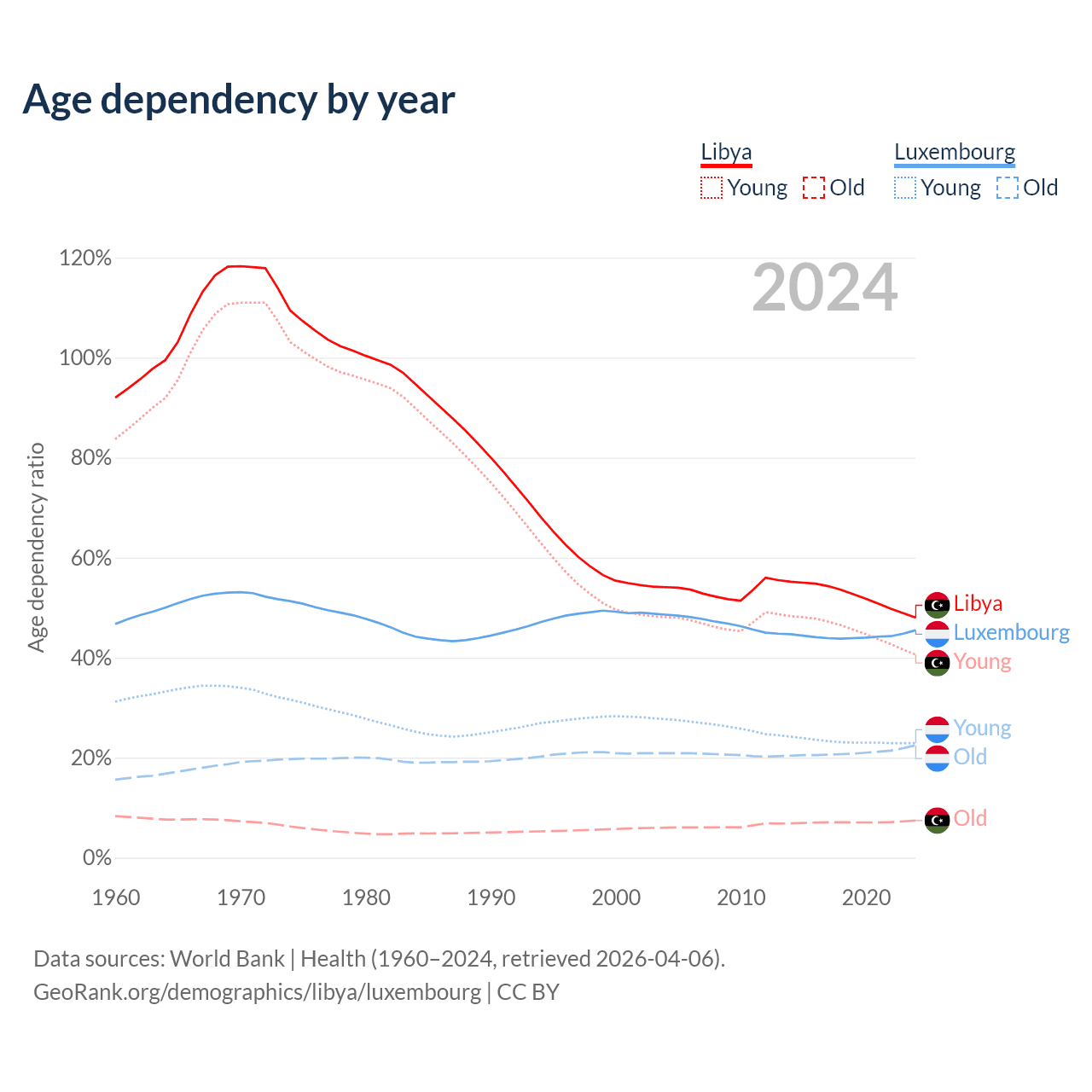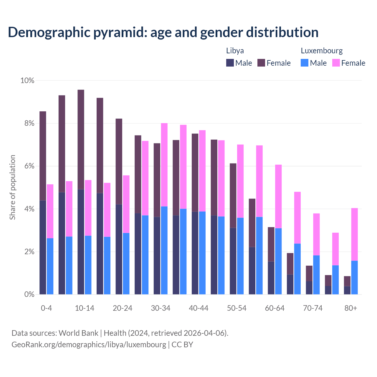 - The share of old-age demographic (65+) in Libya is 5.02% vs 15.5% in Luxembourg.
