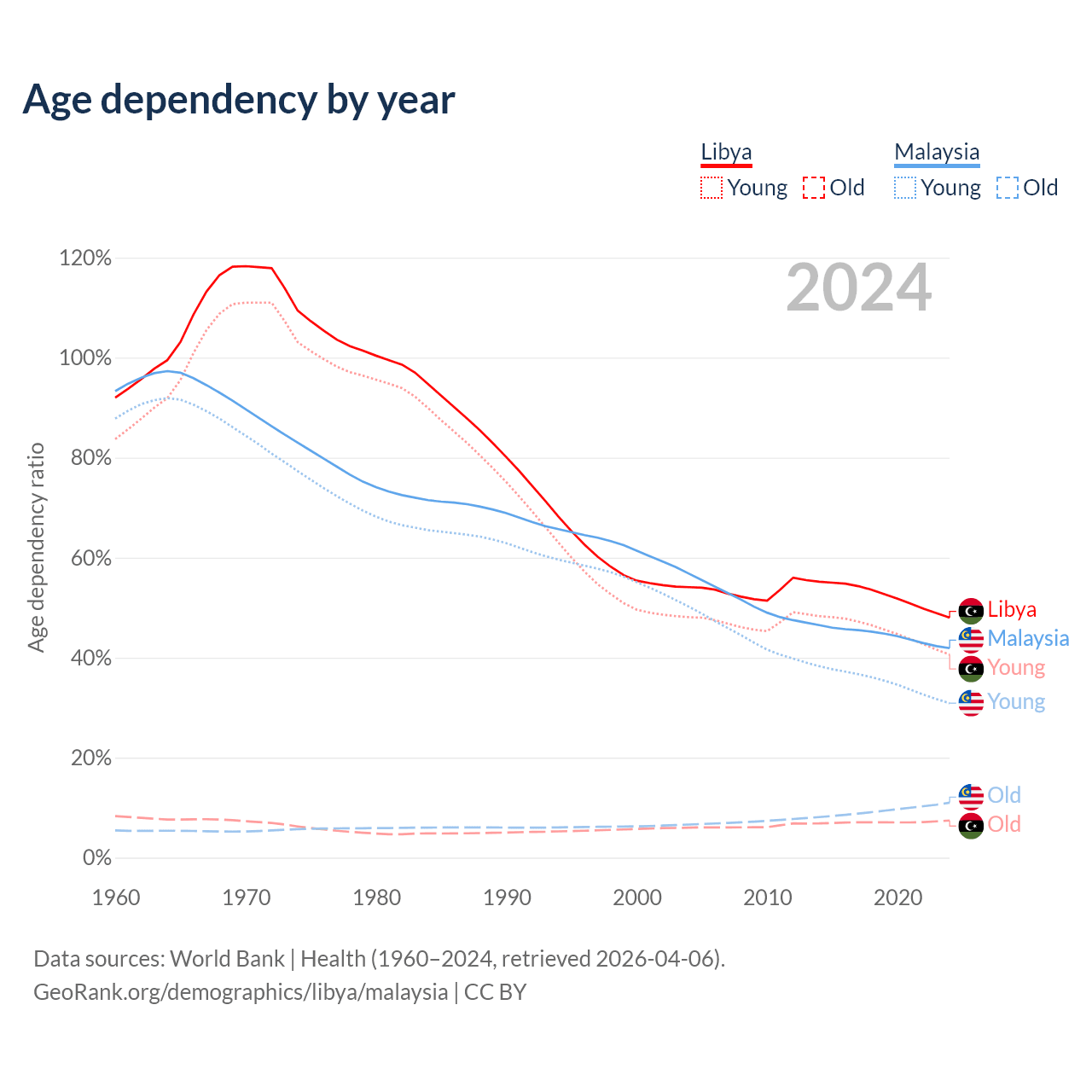 - Libya is ranked 114/196 by median age (oldest to youngest) vs 92/196 for Malaysia.