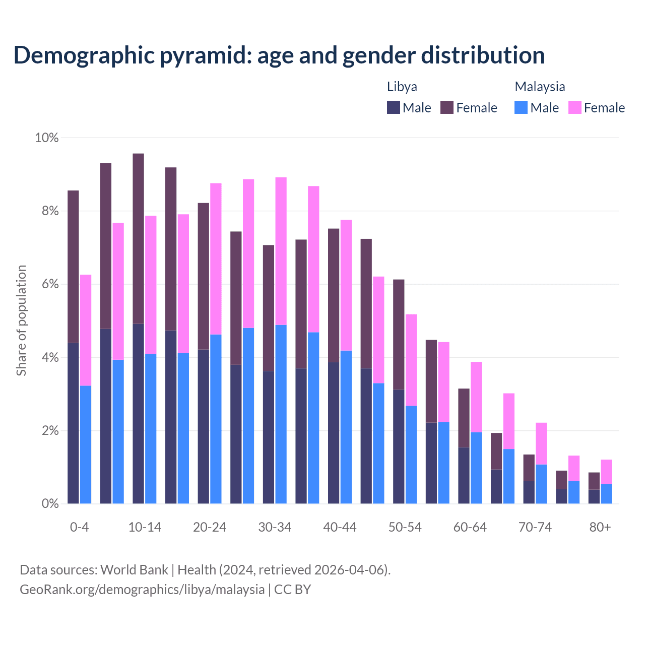 - The median age in Libya is 28.5 years compared to 31.5 years in Malaysia.