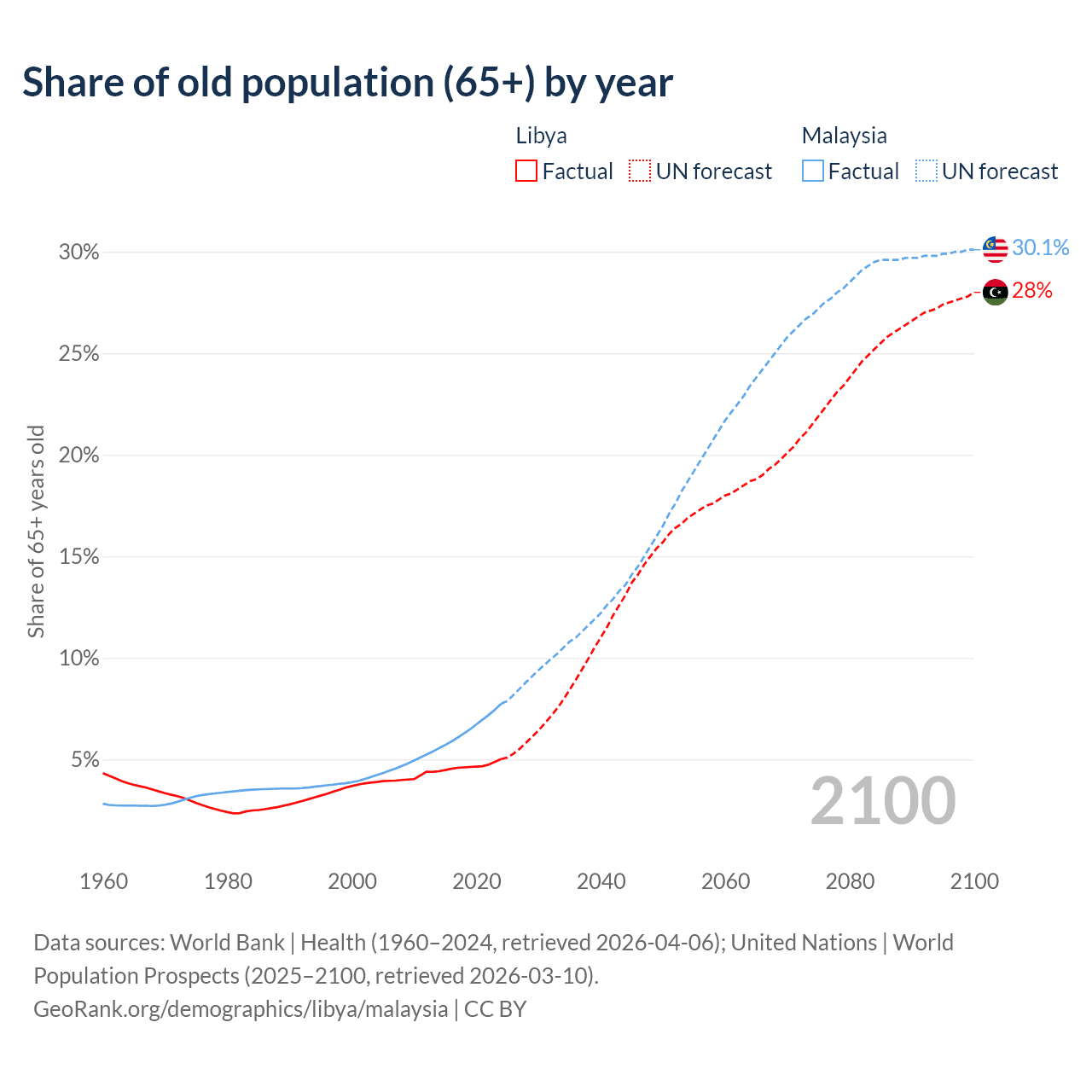 - The share of old-age demographic (65+) in Libya is 5.02% vs 7.74% in Malaysia.