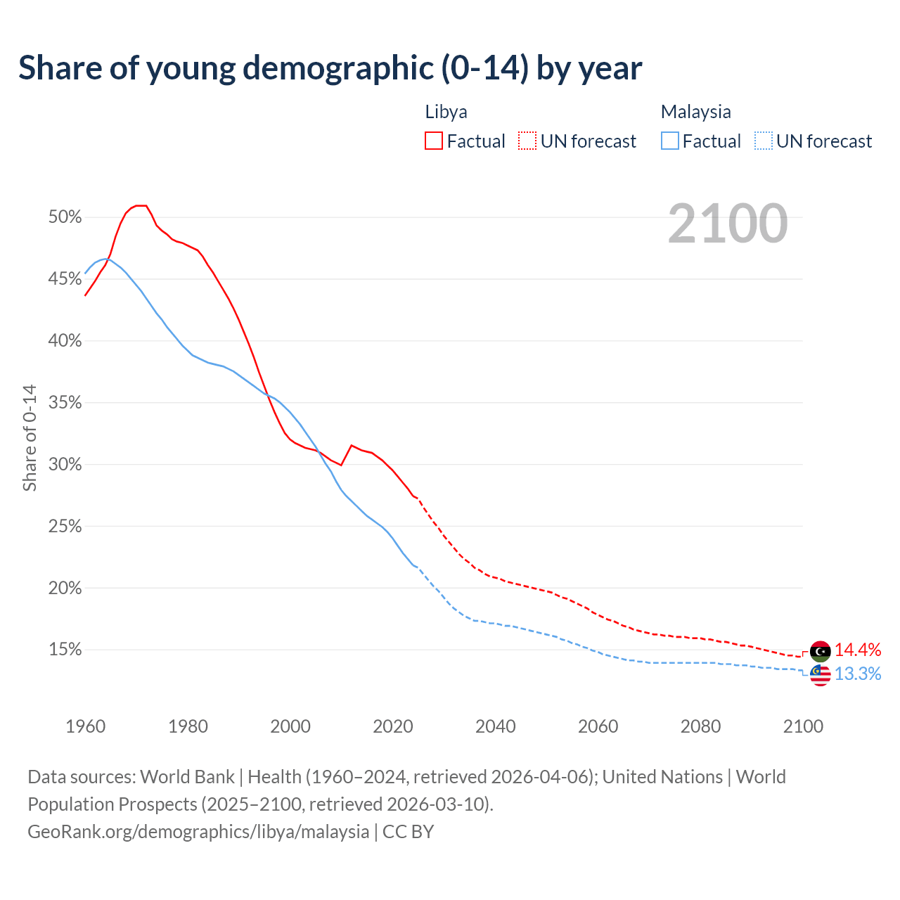 - The share of young demographic (0-15 years old) in Libya is 27.4% vs 21.8% in Malaysia.