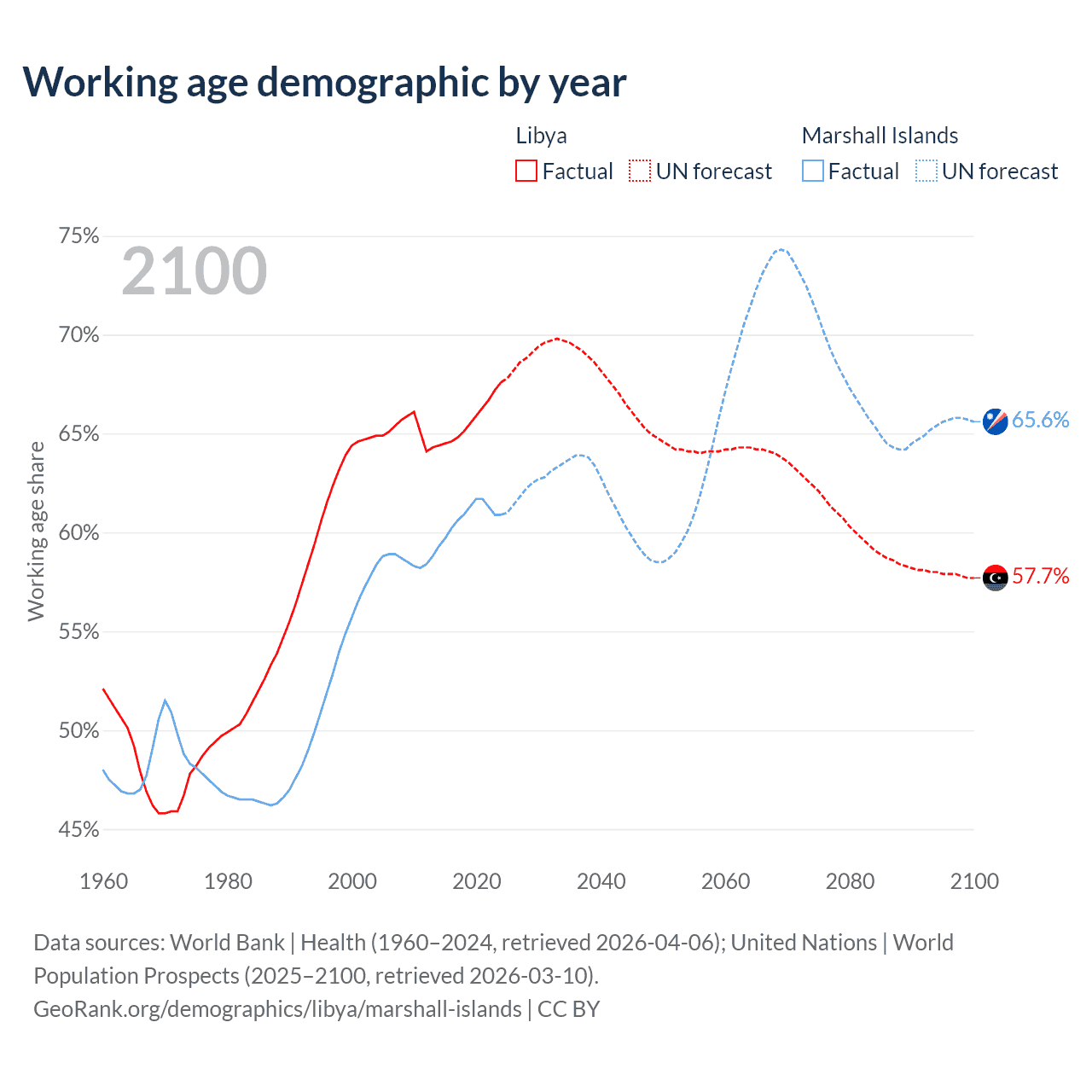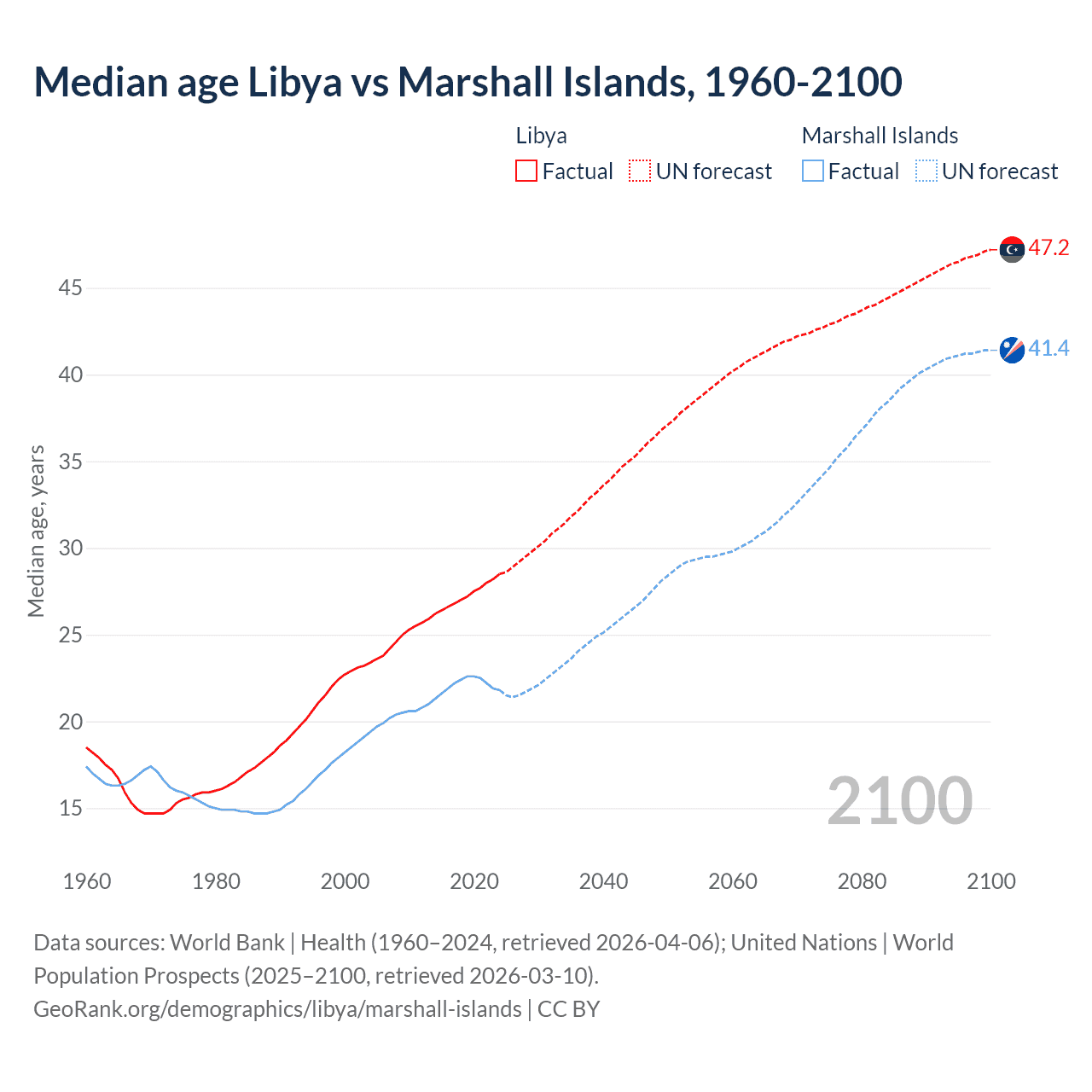 Median age Libya vs Marshall Islands, 1960-2100