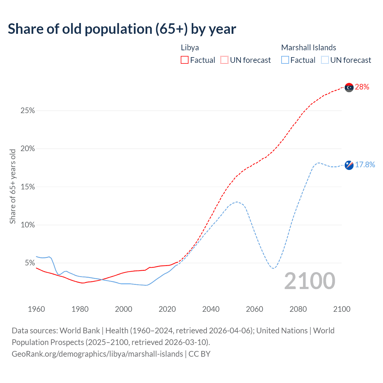 - The share of old-age demographic (65+) in Libya is 5.02% vs 4.64% in the Marshall Islands.
