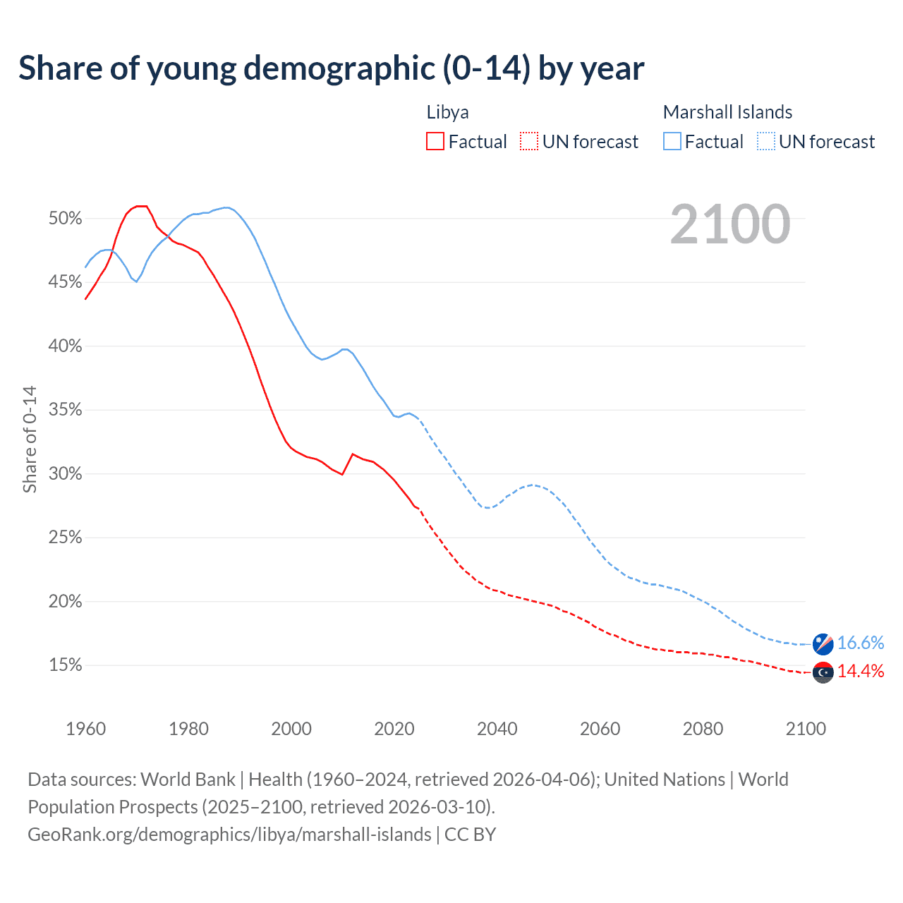 - The share of young demographic (0-15 years old) in Libya is 27.4% vs 34.5% in the Marshall Islands.