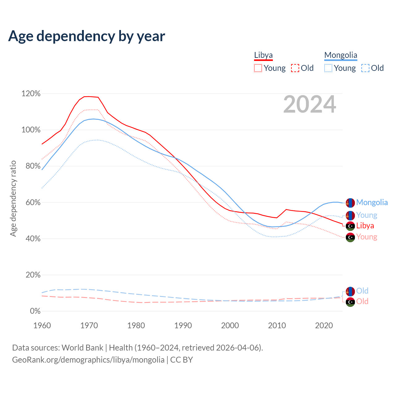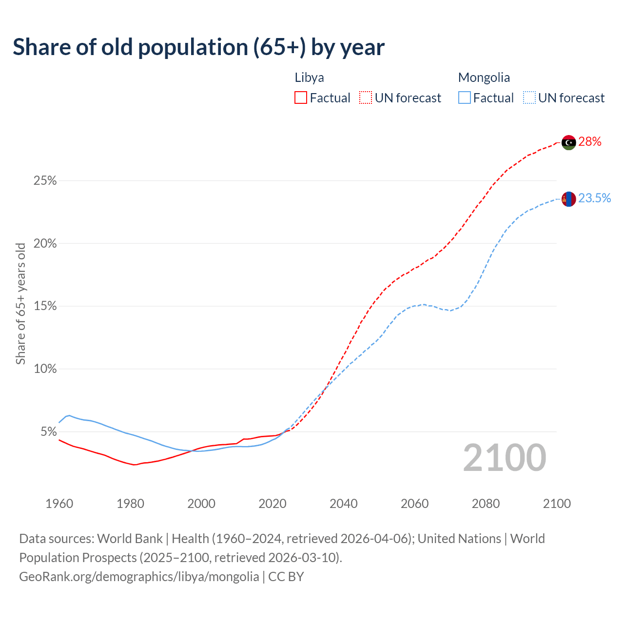 - The share of old-age demographic (65+) in Libya is 5.02% vs 5.14% in Mongolia.