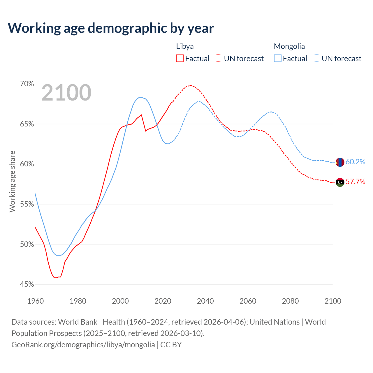 - Libya has 5.11M working age adults (aged 15-64) vs 2.27M in Mongolia.