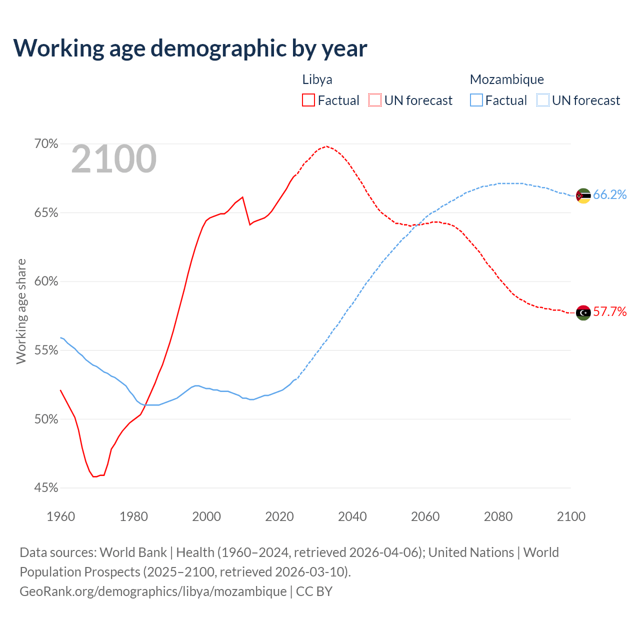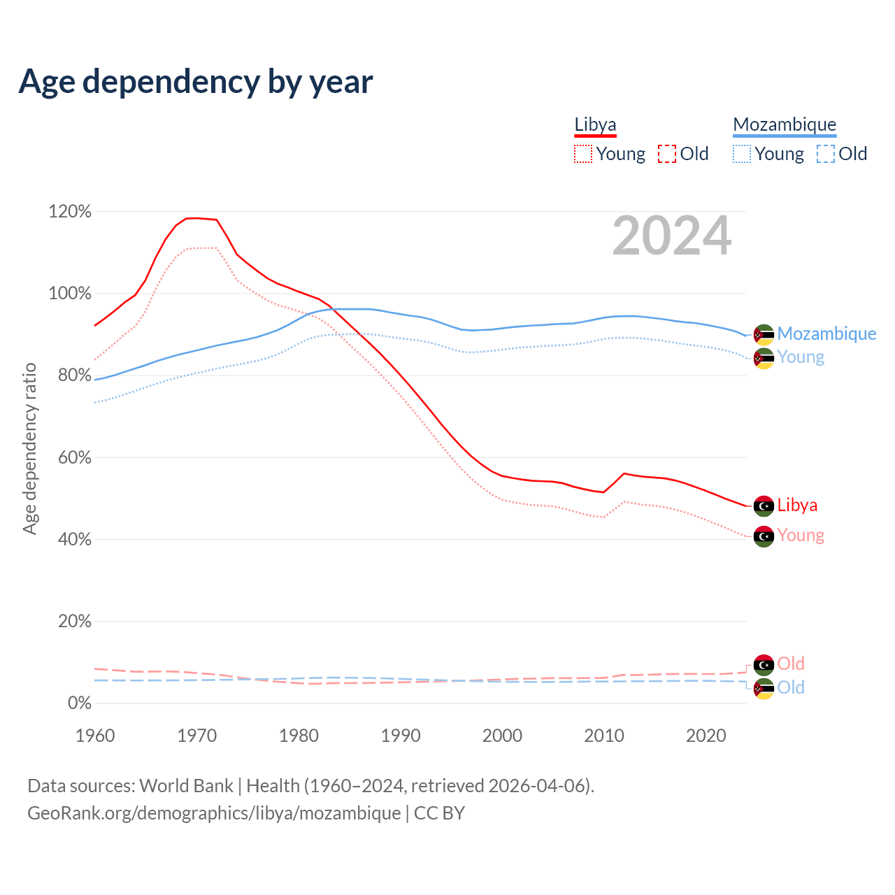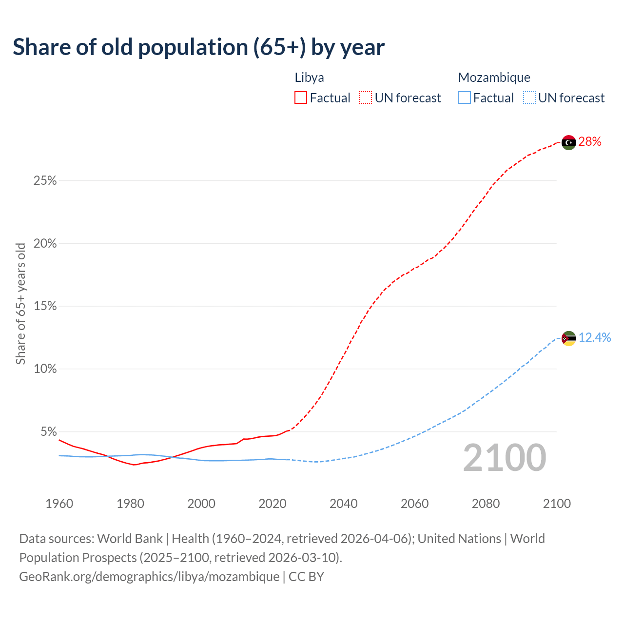 - The share of old-age demographic (65+) in Libya is 5.02% vs 2.75% in Mozambique.