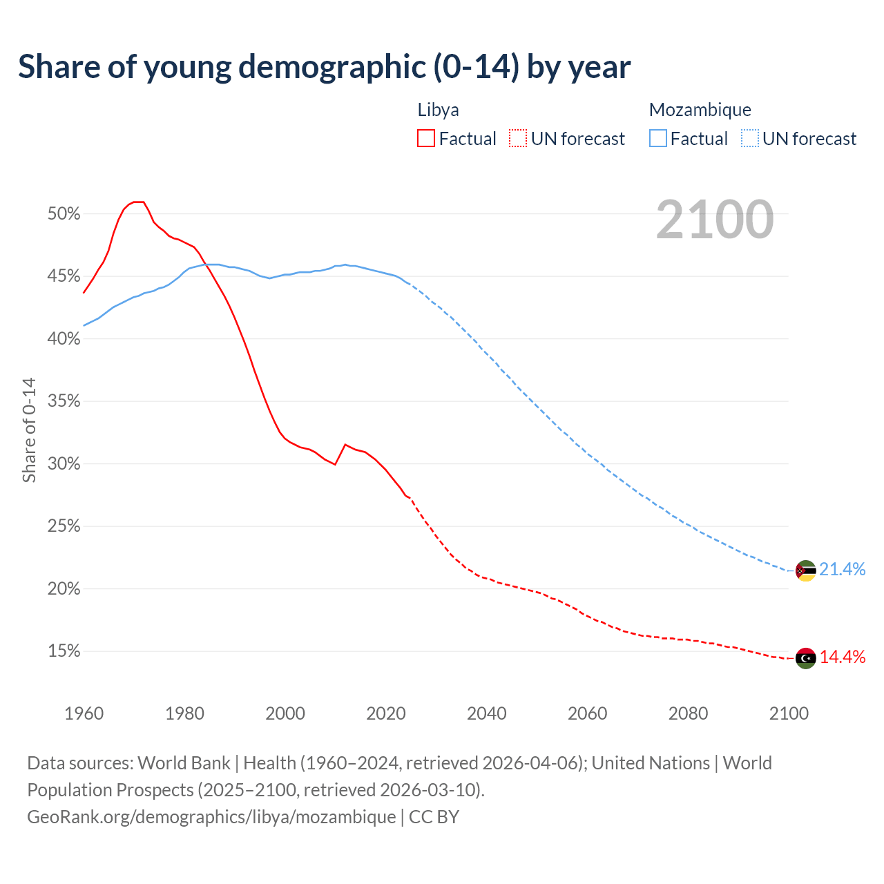 - The share of young demographic (0-15 years old) in Libya is 27.4% vs 44.5% in Mozambique.