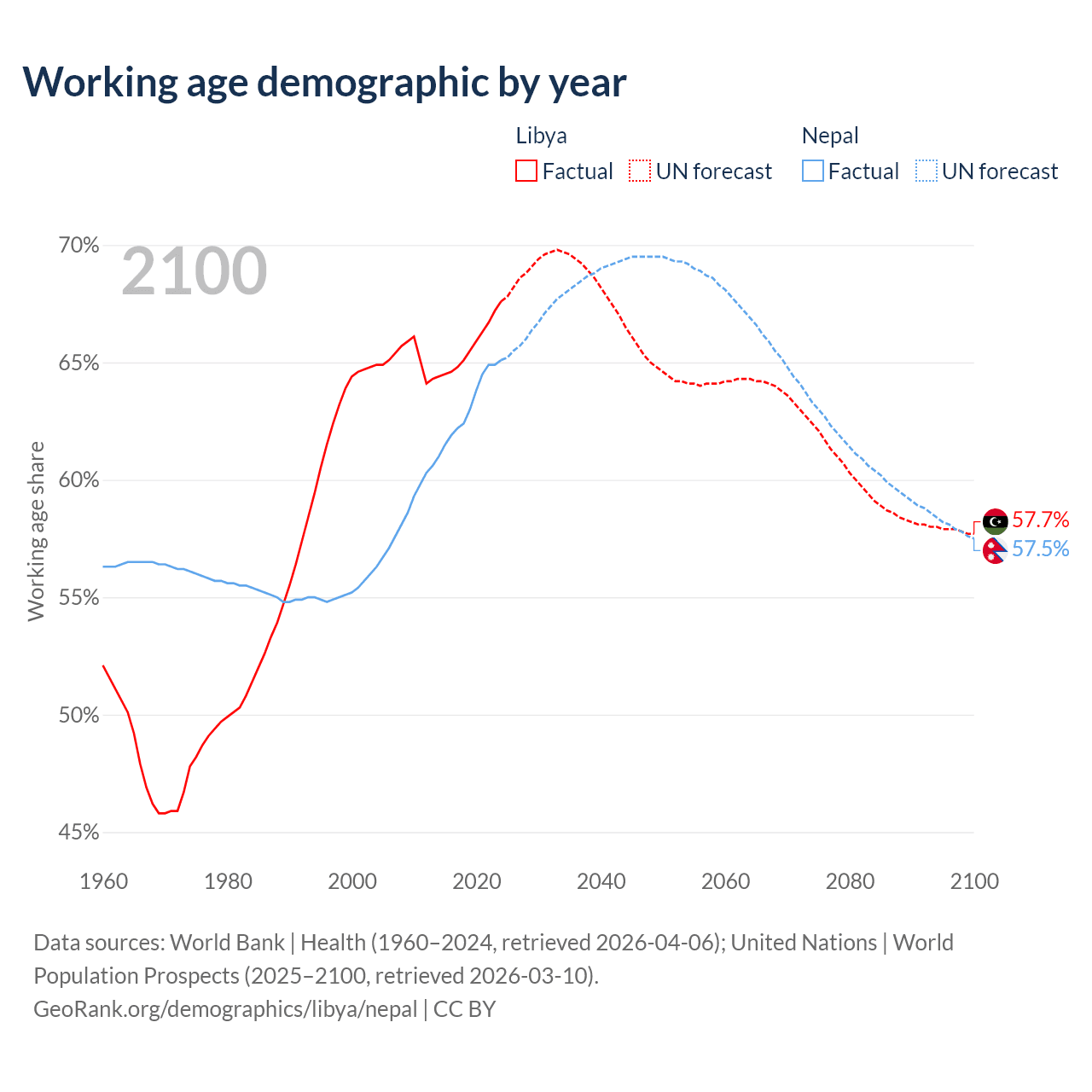 Median age Libya vs Nepal, 1960-2100