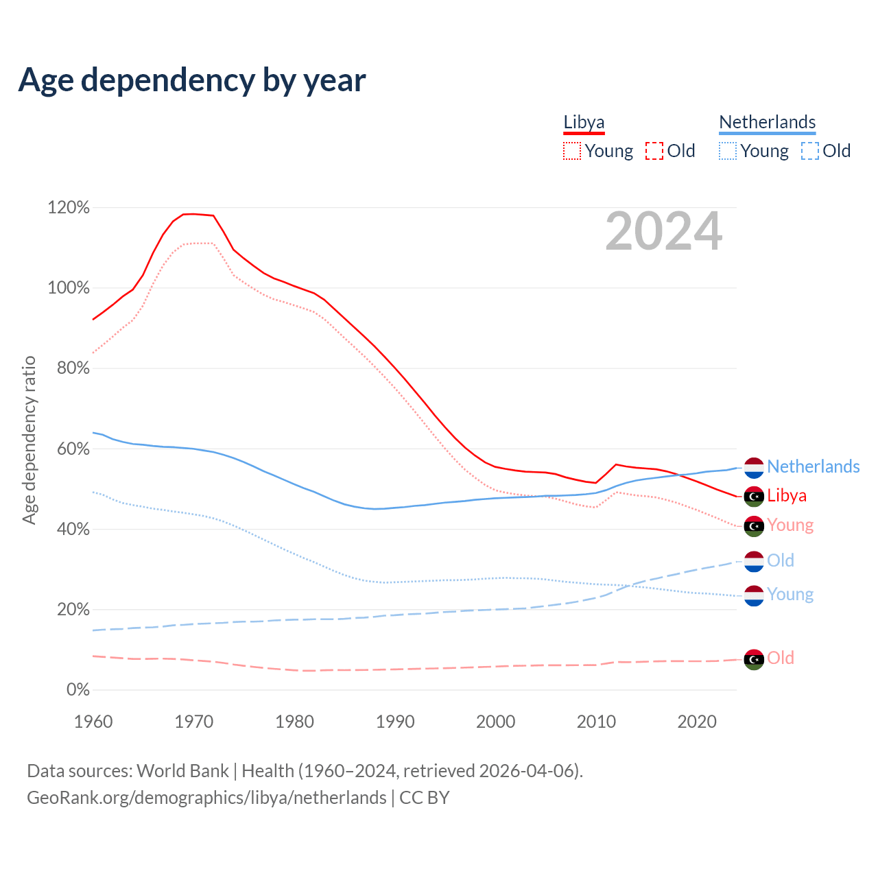 - Libya is ranked 114/196 by median age (oldest to youngest) vs 33/196 for the Netherlands.