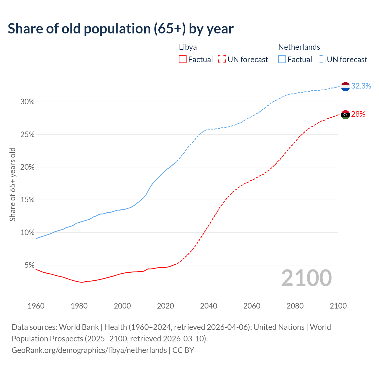 - The share of old-age demographic (65+) in Libya is 5.02% vs 20.5% in the Netherlands.