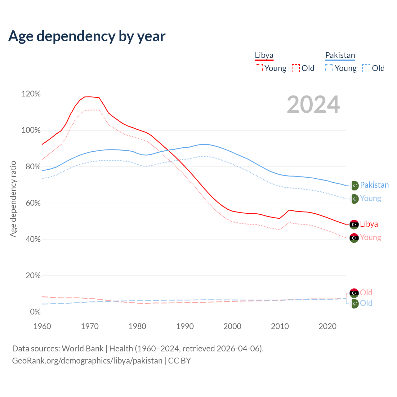 - Libya is ranked 114/196 by median age (oldest to youngest) vs 154/196 for Pakistan.