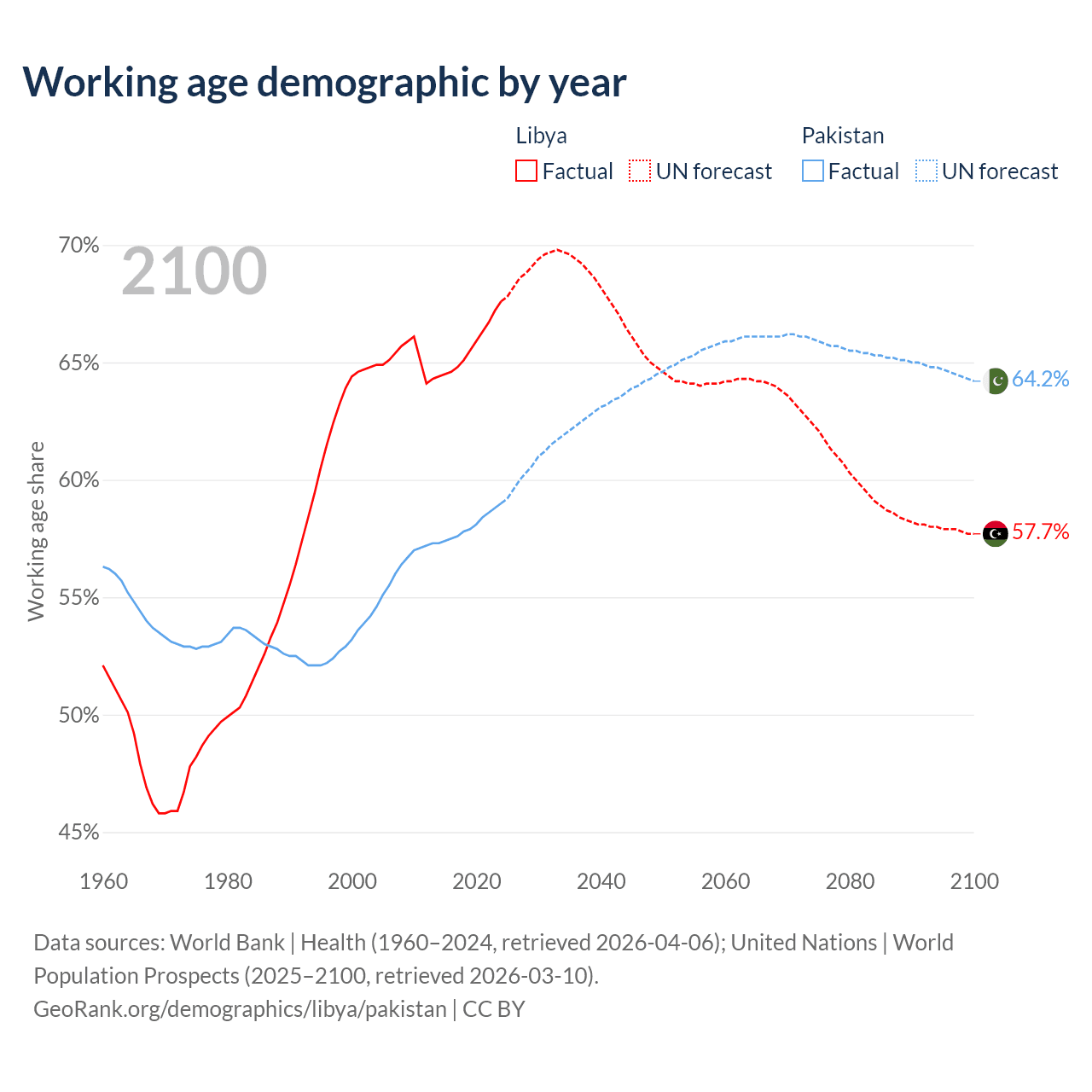 - Libya has 5.11M working age adults (aged 15-64) vs 154M in Pakistan.