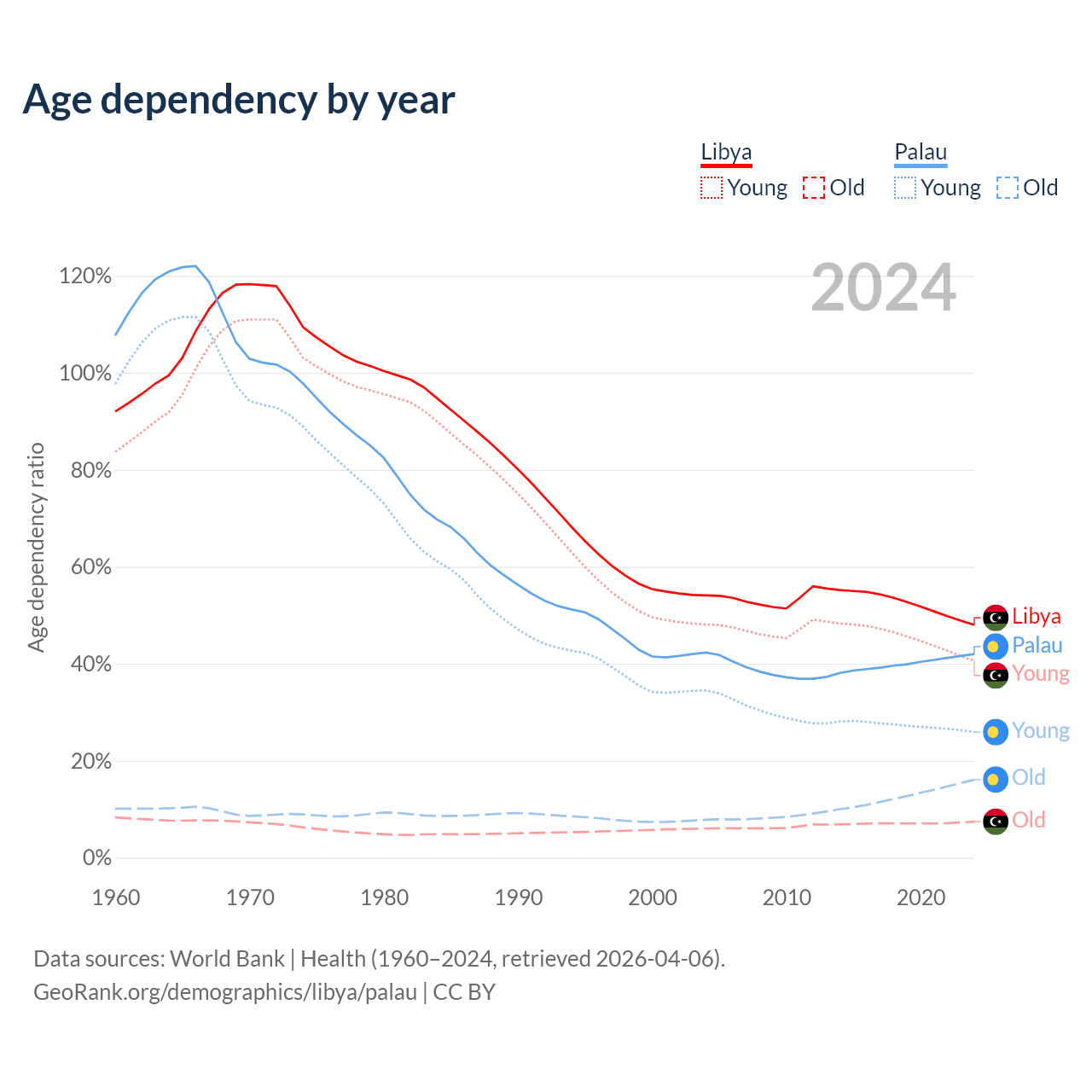 - Libya is ranked 114/196 by median age (oldest to youngest) vs 53/196 for Palau.