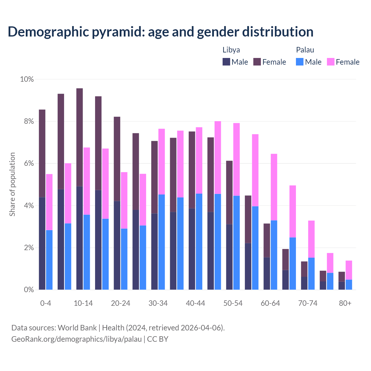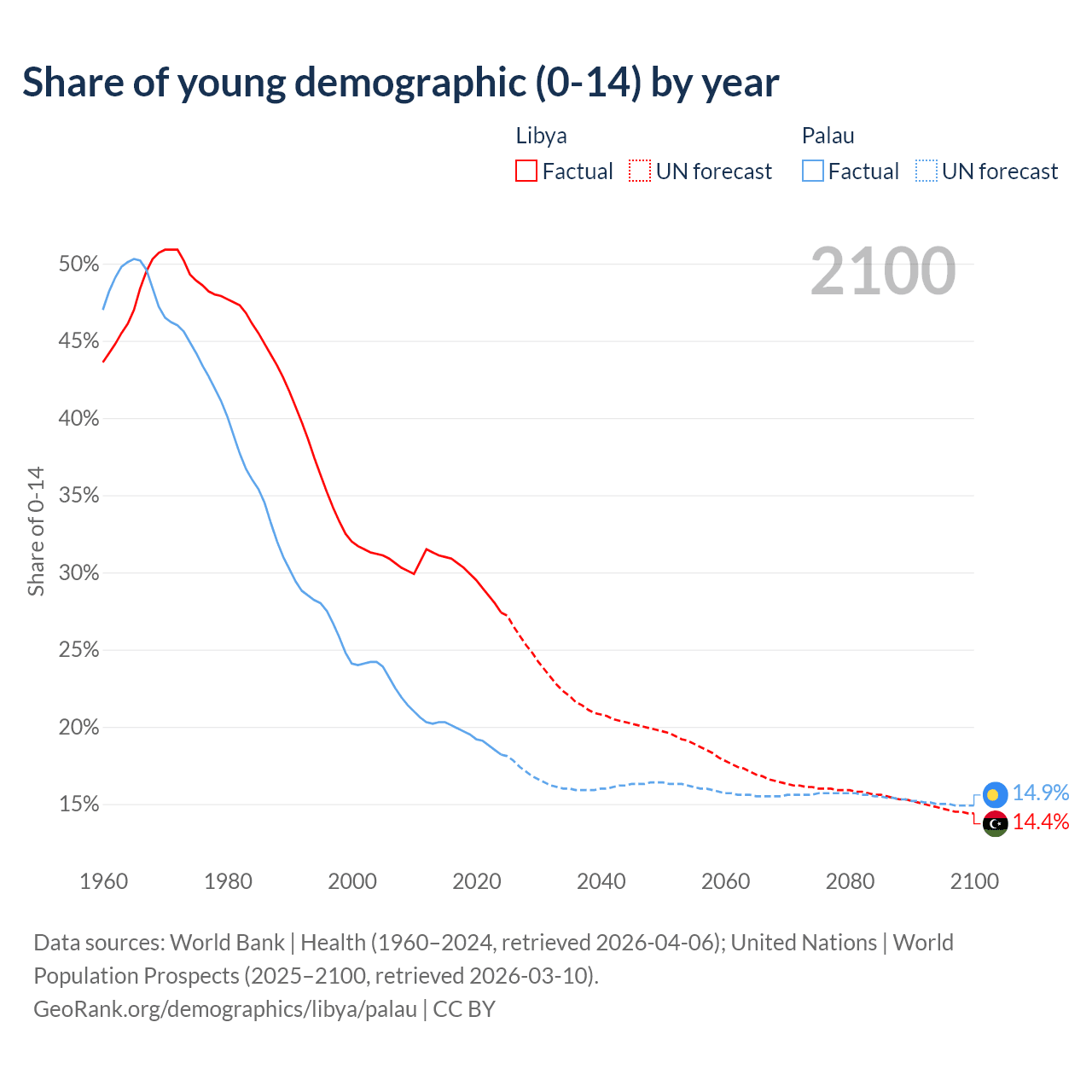 - The share of young demographic (0-15 years old) in Libya is 27.4% vs 18.2% in Palau.