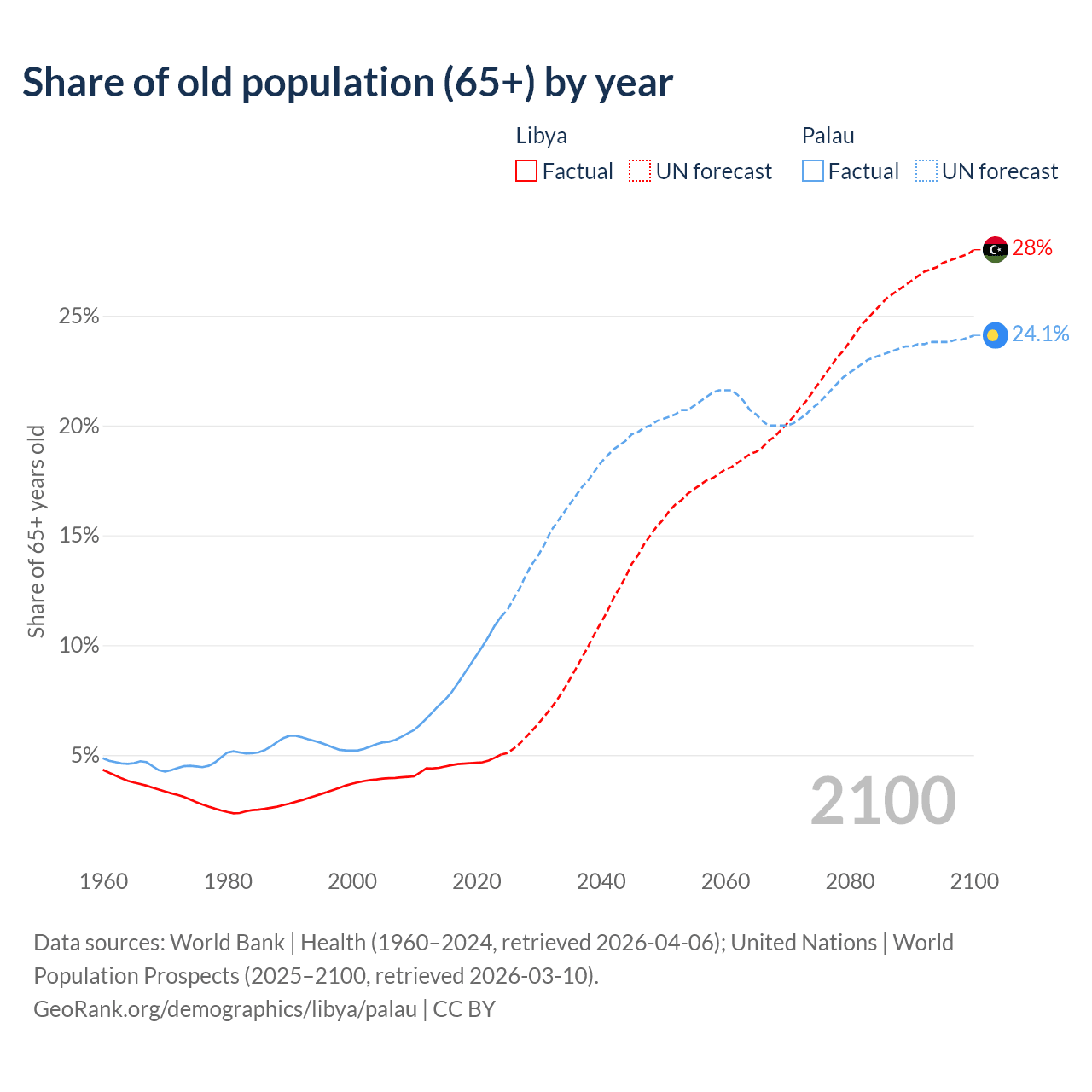 - The share of old-age demographic (65+) in Libya is 5.02% vs 11.3% in Palau.