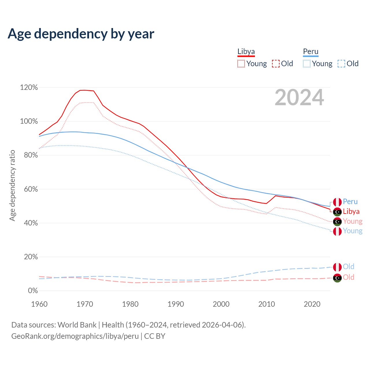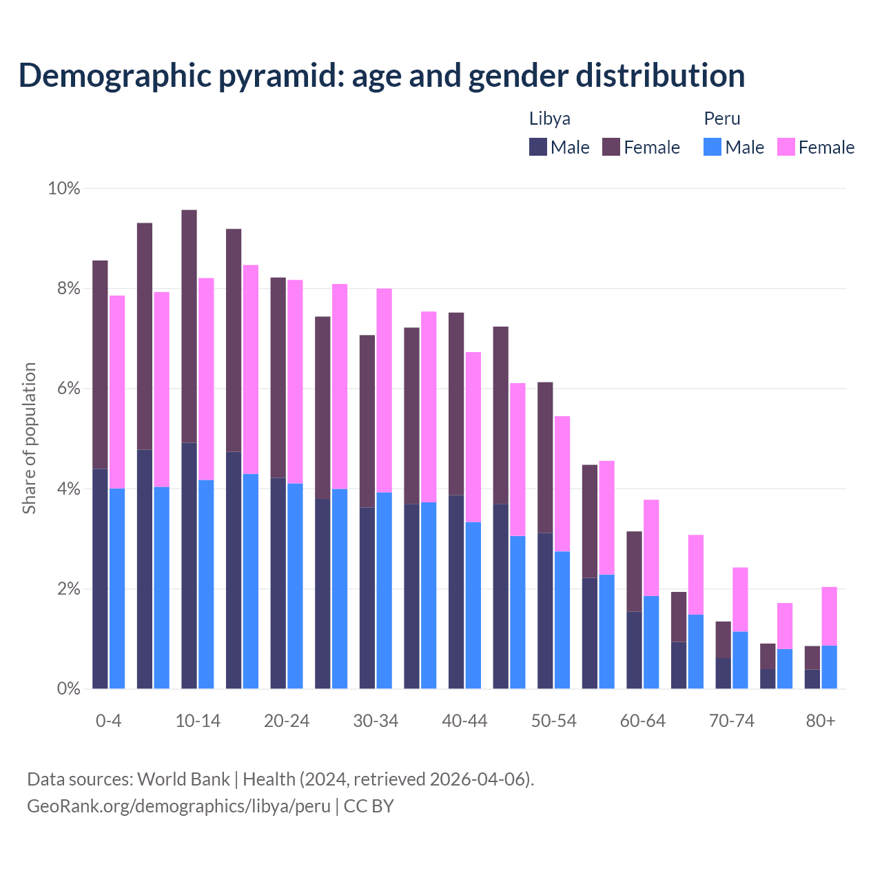 - Libya is ranked 114/196 by median age (oldest to youngest) vs 97/196 for Peru.
