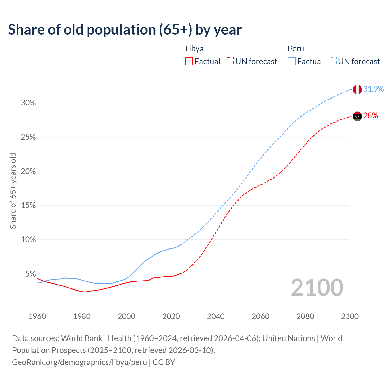 The share of older people aged 65 and over is 5.02% in Libya and 9.23% in Peru. Life expectancy in Libya compared to Peru .