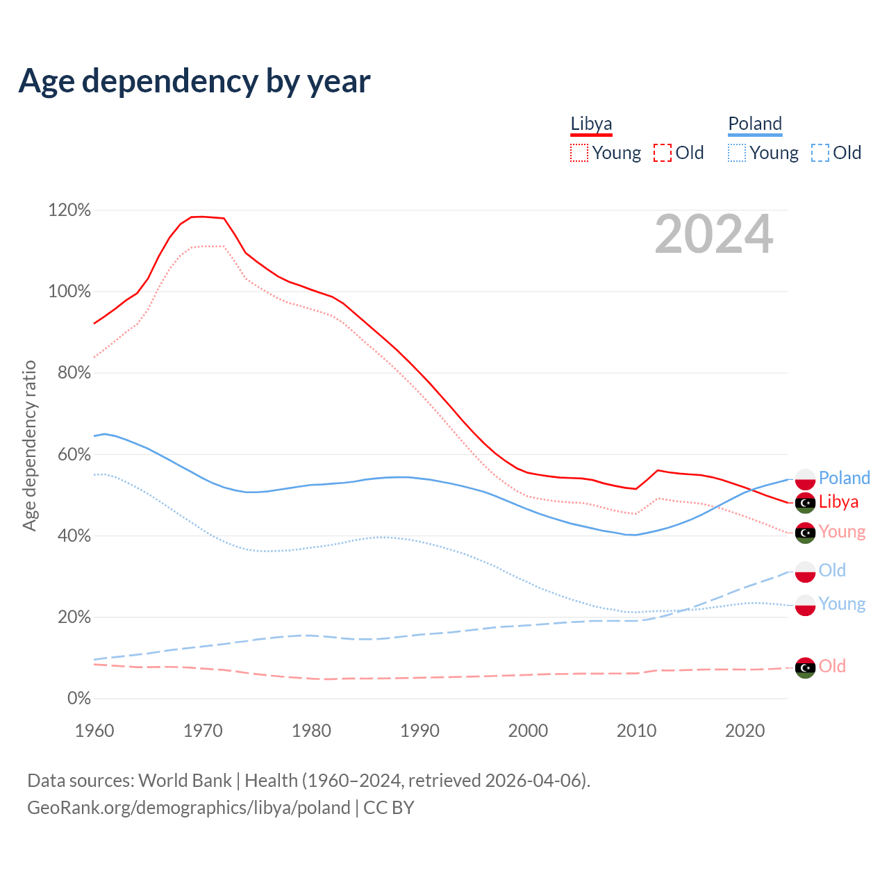 - Libya is ranked 114/196 by median age (oldest to youngest) vs 30/196 for Poland.