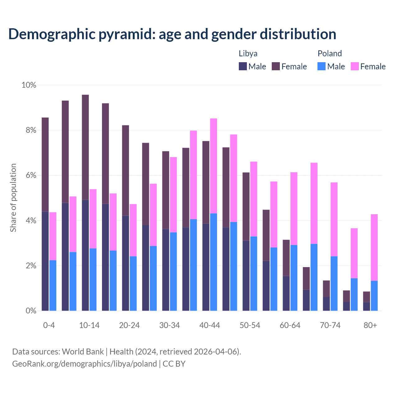 - The share of old-age demographic (65+) in Libya is 5.02% vs 20.1% in Poland.