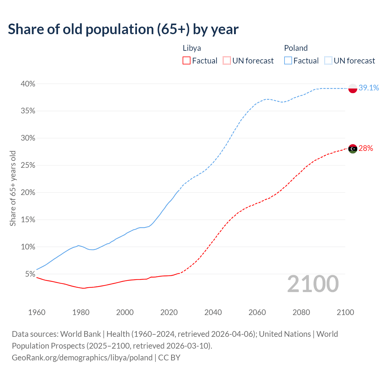Median age Libya vs Poland, 1960-2100