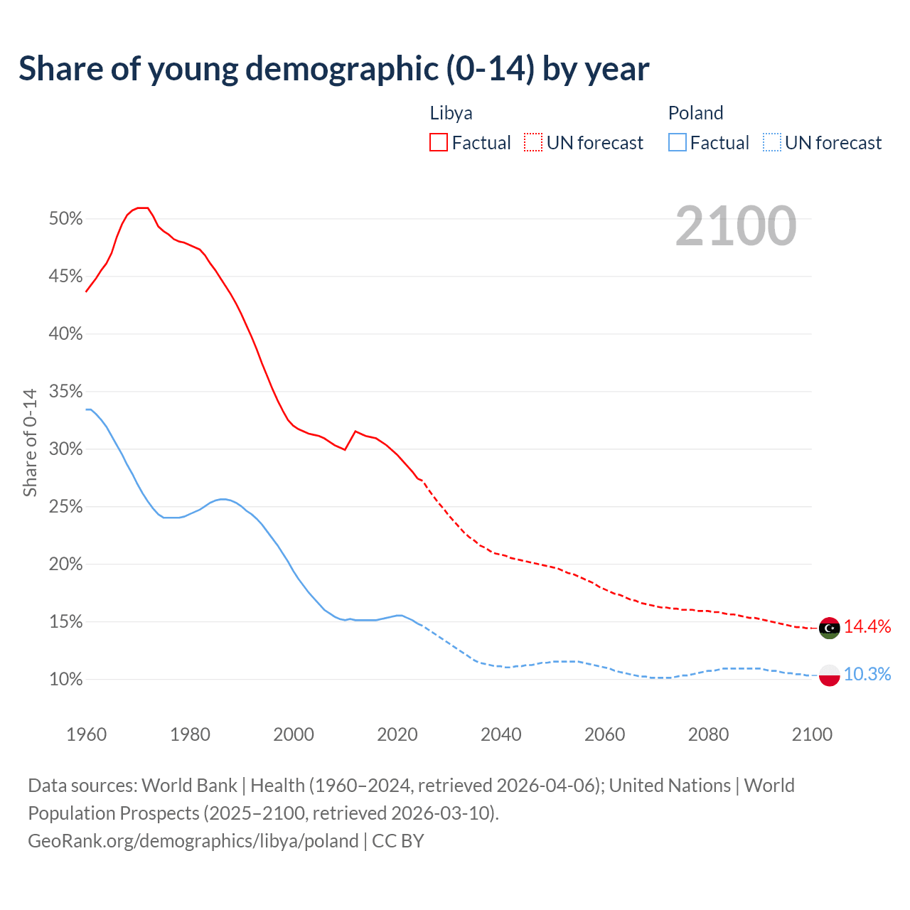 - The share of young demographic (0-15 years old) in Libya is 27.4% vs 14.8% in Poland.