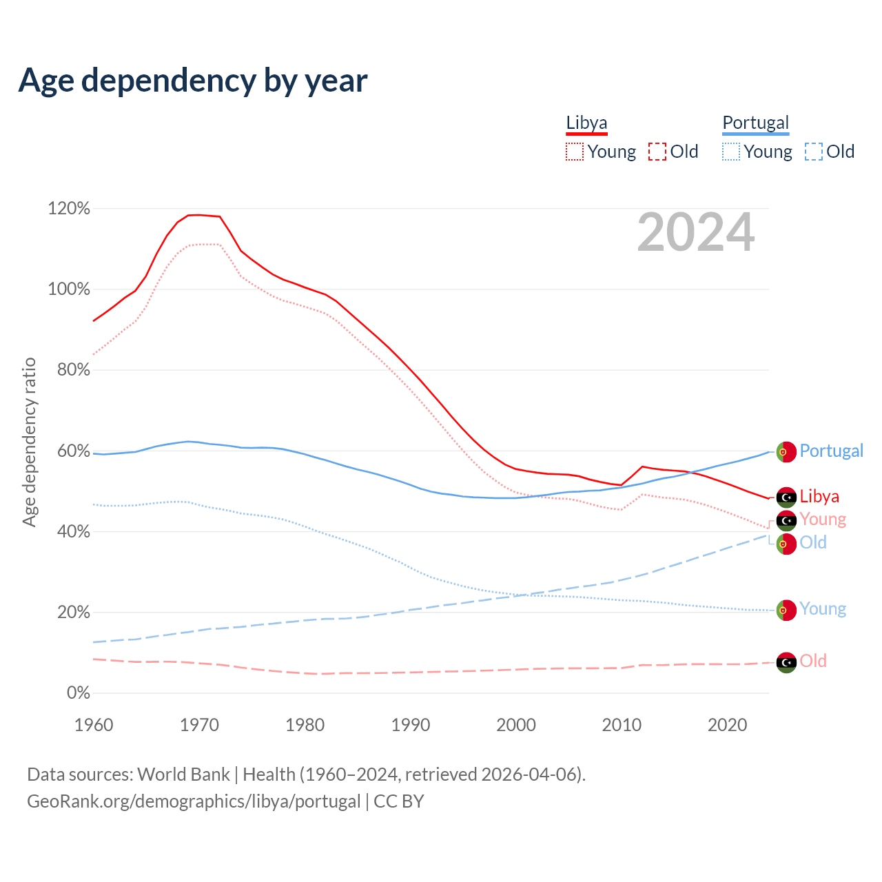The share of older people aged 65 and over is 5.02% in Libya and 24.5% in Portugal. Life expectancy in Libya compared to Portugal .