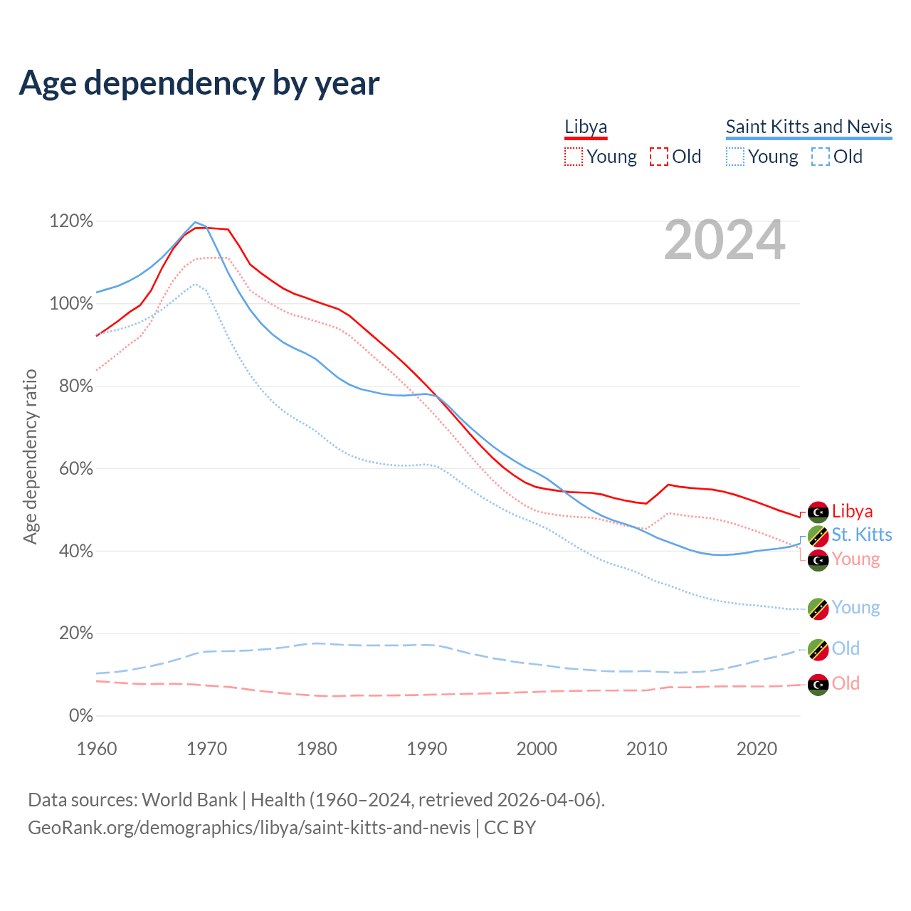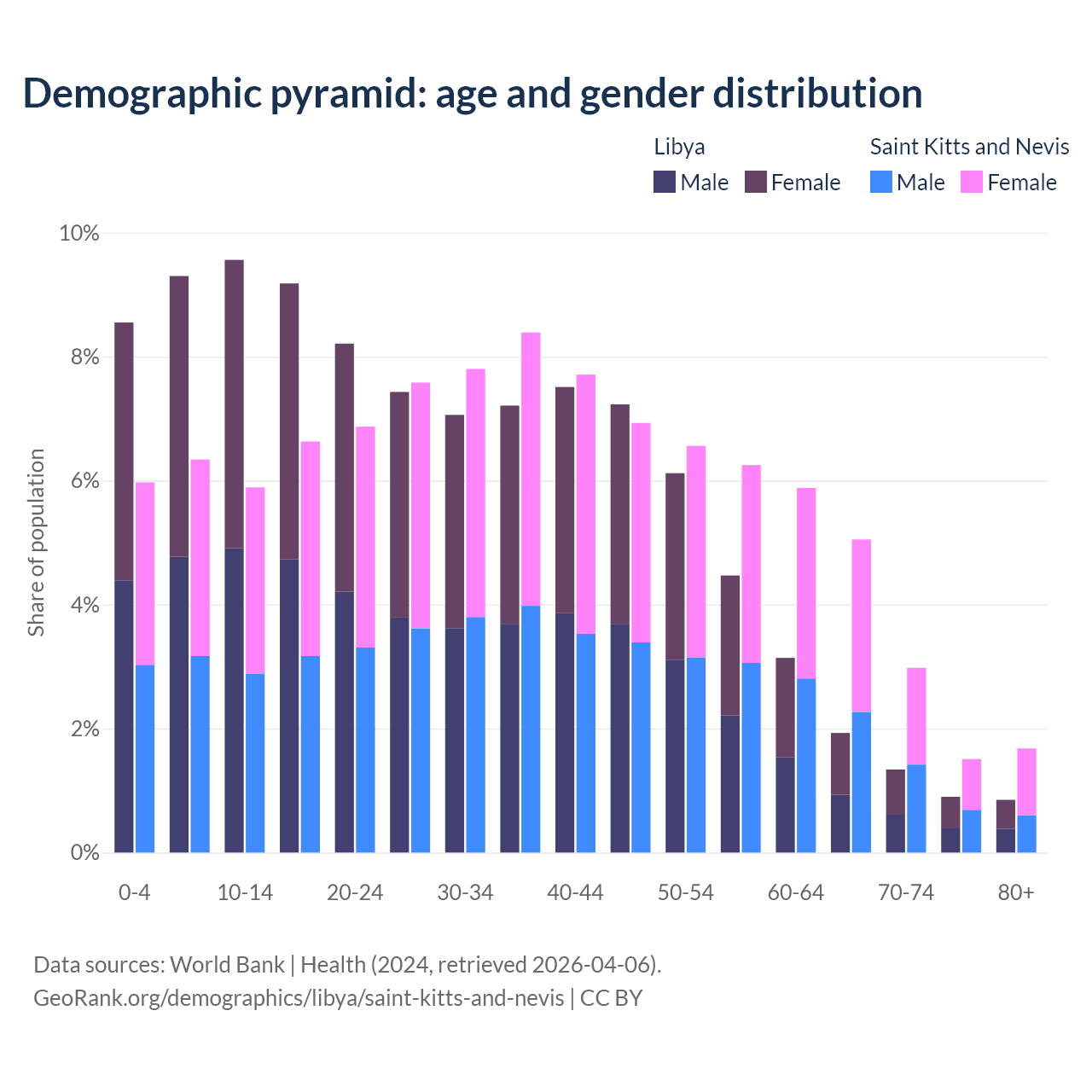 - The share of old-age demographic (65+) in Libya is 5.02% vs 11.2% in Saint Kitts and Nevis.