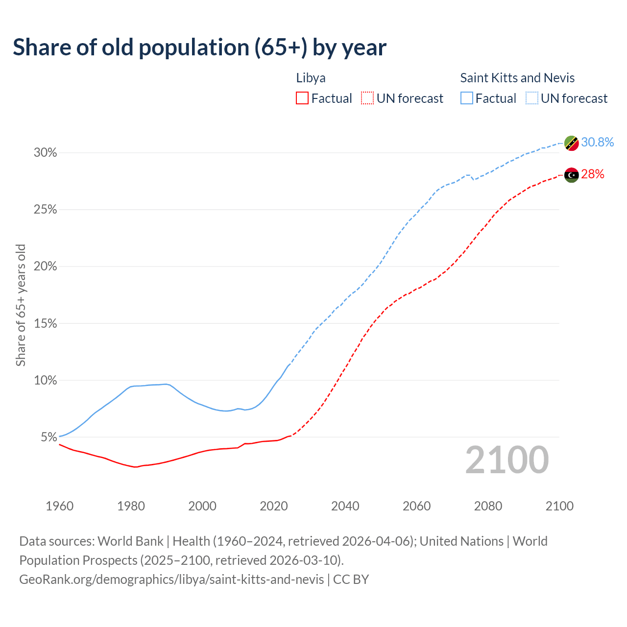 The share of older people aged 65 and over is 5.02% in Libya and 11.2% in Saint Kitts and Nevis. Life expectancy in Libya compared to Saint Kitts and Nevis .